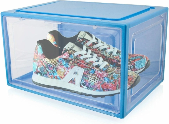 Ciesz się porządkiem w szafce na buty dzięki zestawowi trzech praktycznych pudełek na buty w kolorze niebieskim. Mają przednie uchylne drzwiczki z magnetycznym zamknięciem, trzy przezroczyste boki dla łatwej kontroli zawartości i można je bez trudu układać w kolumny. Składana konstrukcja z łatwym montażem, magnetycznym zamknięciem, przezroczystymi ściankami oraz możliwością sztaplowania dla oszczędności miejsca.