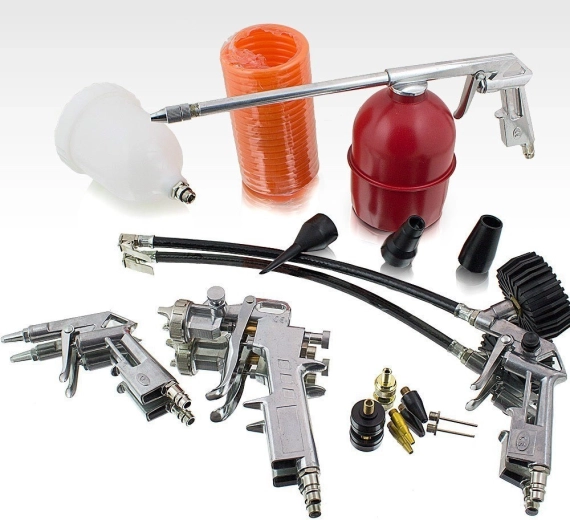 Ten wszechstronny zestaw akcesoriów do kompresora obejmuje najczęstsze prace w garażu, warsztacie i wokół domu. Dzięki bogatemu wyposażeniu poradzisz sobie z nanoszeniem środków konserwujących, lakierowaniem różnych powierzchni, kontrolą i pompowaniem opon, przedmuchem oraz czyszczeniem pod ciśnieniem.
