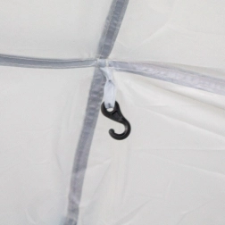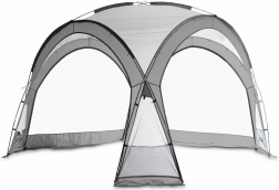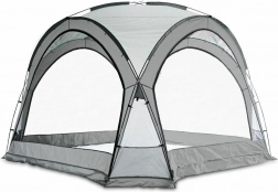 Cztery zintegrowane ściany z siatki chronią przed owadami, jednocześnie przepuszczając powietrze i światło. Dwie dołączone nieprzezroczyste ścianki boczne tworzą osłonę od wiatru, cień i prywatność. W środku znajdziesz 4 przestronne kieszenie na drobiazgi oraz praktyczny sufitowy haczyk na lampę. Dla wygodnego transportu w zestawie jest torba transportowa; stabilność zwiększają odciągi i śledzie.