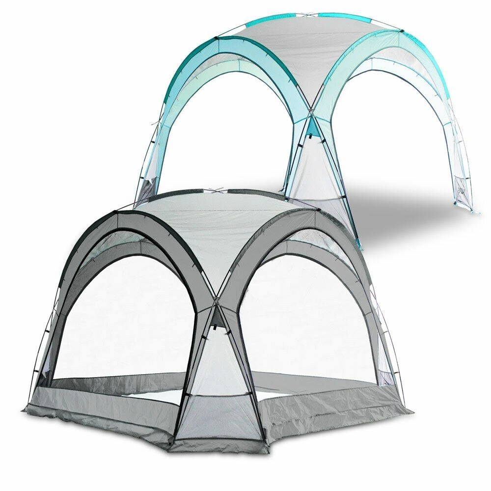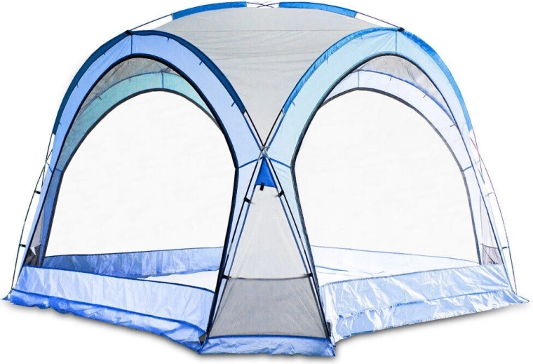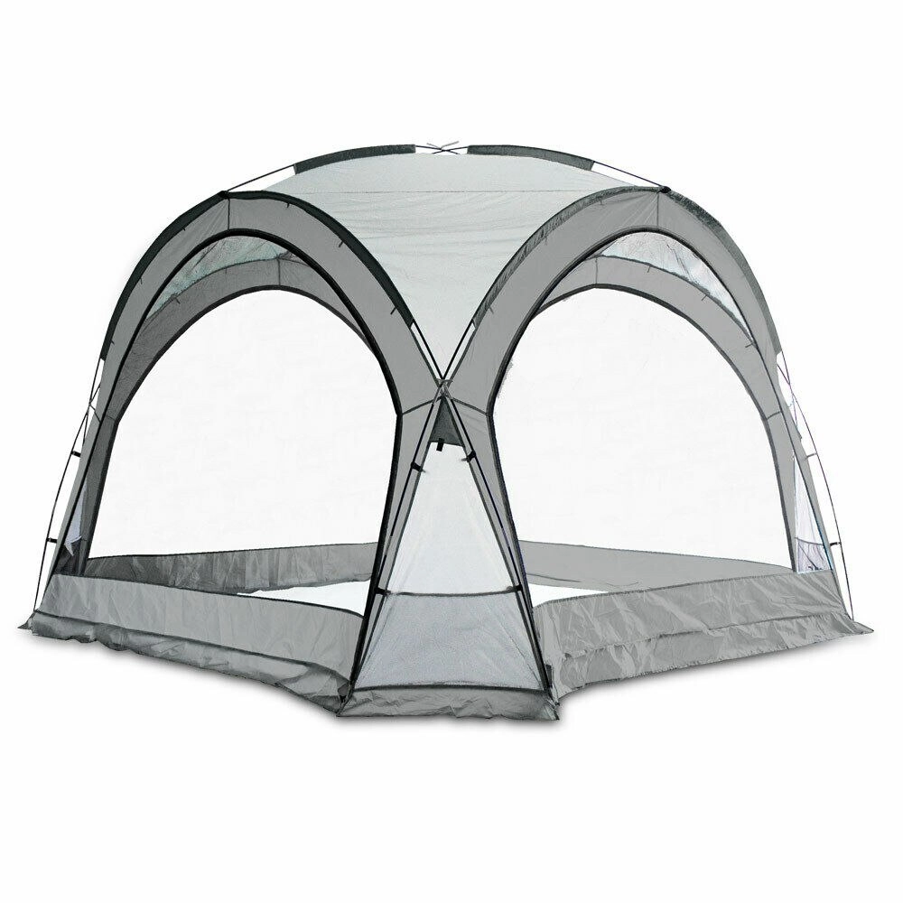 Uniwersalny namiot ogrodowy i kempingowy zapewnia niezawodną ochronę przed słońcem, deszczem i promieniowaniem UV. Dzięki lekkim i wytrzymałym prętom z włókna szklanego łatwo się rozkłada i jest stabilny. Cztery siatkowane ściany przeciw owadom oraz dwie nieprzezroczyste ścianki boczne gwarantują prywatność i osłonę od wiatru. Podklejane szwy zwiększają wodoodporność, a przestronne wnętrze oferuje duże kieszenie i uchwyt na lampę.