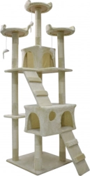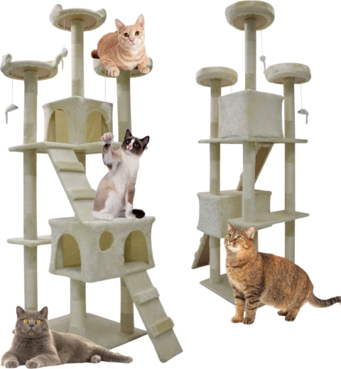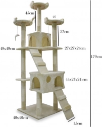 Duże kocie centrum drapania i zabawy o wysokości 170 cm oferuje wszystko dla aktywnych i spokojnych kotów: 7 poziomów do wspinaczki i odpoczynku, 2 przytulne domki, 3 platformy widokowe, sisalowe słupki do drapania, zawieszane zabawki oraz stabilną konstrukcję z miękkim obiciem dla maksymalnego komfortu.