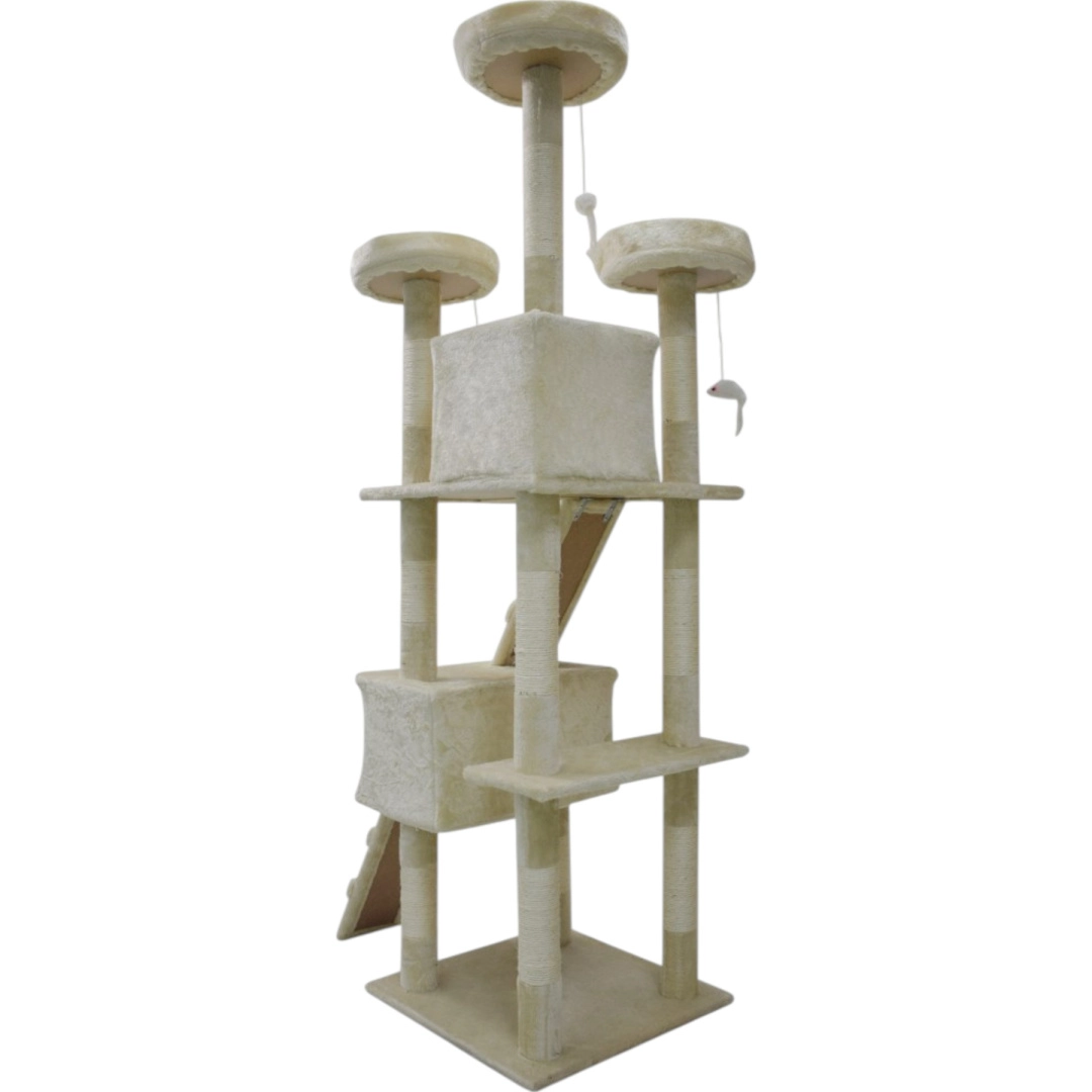 Słupki owinięte naturalnym sizalem chronią meble przed pazurami, zawieszane zabawki pobudzają instynkt łowiecki, a rampa/drabinka ułatwia dostęp na wyższe poziomy. Neutralny kolor łatwo wpasuje się w każde wnętrze, a łatwy montaż z dołączoną instrukcją pozwoli szybko uruchomić zestaw.