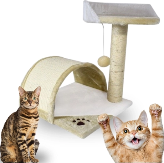 Szukasz małego, ale w pełni wyposażonego drapaka, który zapewni Twojemu kotu własną bezpieczną przystań? Ten model łączy hamak do leniuchowania, budkę pokrytą sizalem do chowania się i drapania oraz sizalowy słupek do regularnej pielęgnacji pazurów. Miękki plusz gwarantuje wygodę, a solidna płyta MDF — stabilność.