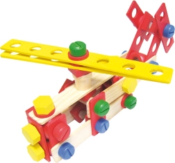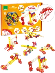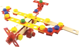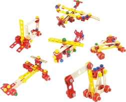 Kolorowe i naturalne listewki, śruby, nakrętki, koła i łączniki pozwalają dzieciom składać pojazdy oraz fantazyjne konstrukcje i wielokrotnie je przebudowywać.