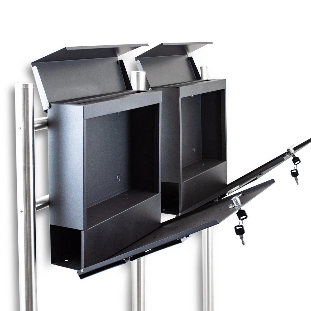 Elegancka i praktyczna skrzynka pocztowa w zestawie z dwoma boxami na solidnym stojaku ze stali nierdzewnej została zaprojektowana z myślą o wygodnym, codziennym użytkowaniu. Szeroki otwór wrzutowy ułatwia wkładanie listów i mniejszych przesyłek, a oddzielny schowek bezpiecznie pomieści gazety czy ulotki, aby nie zajmowały miejsca w głównej skrzynce.