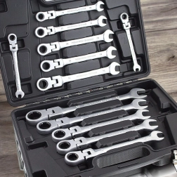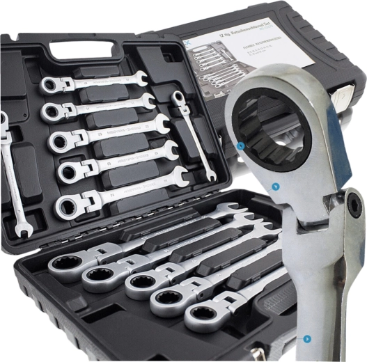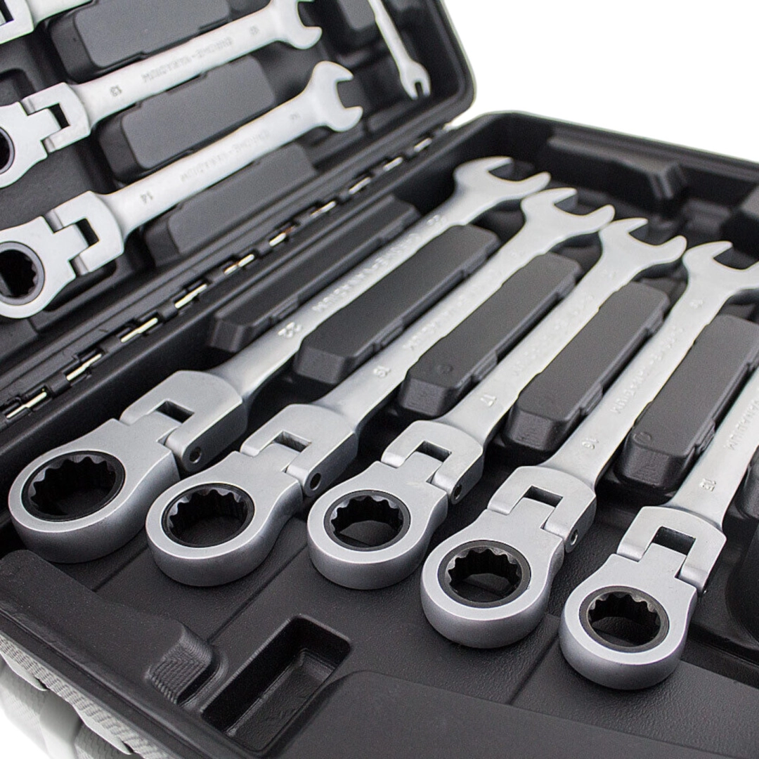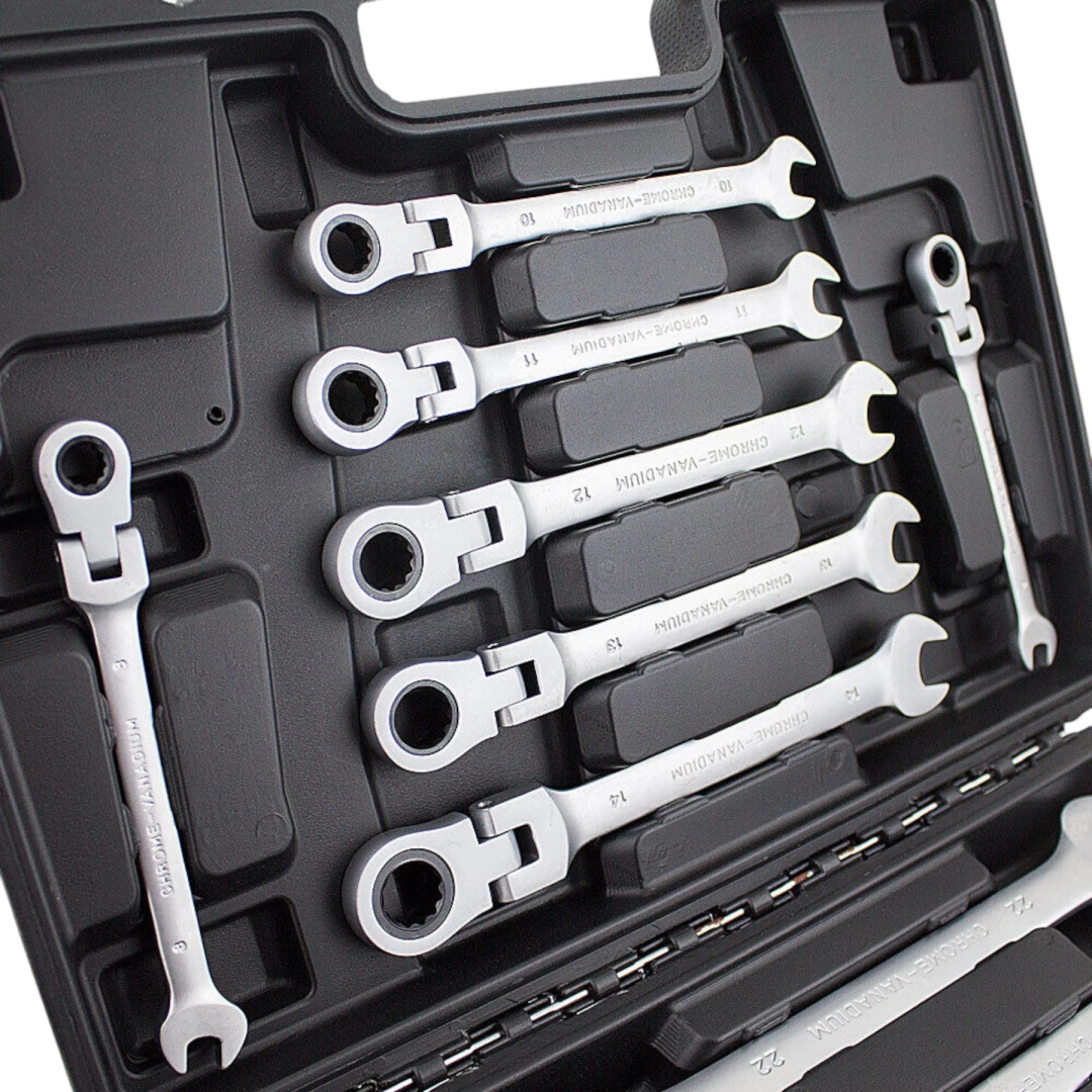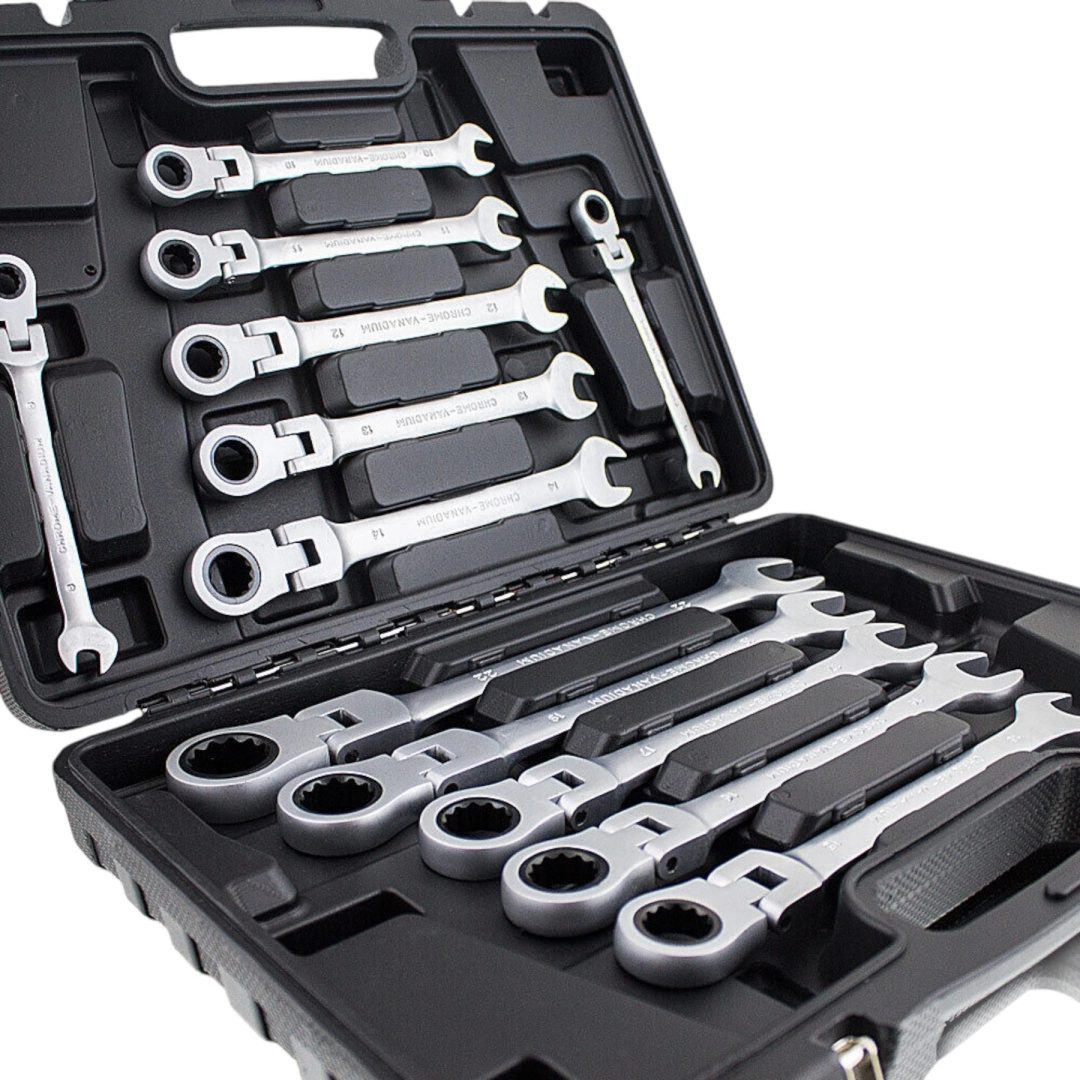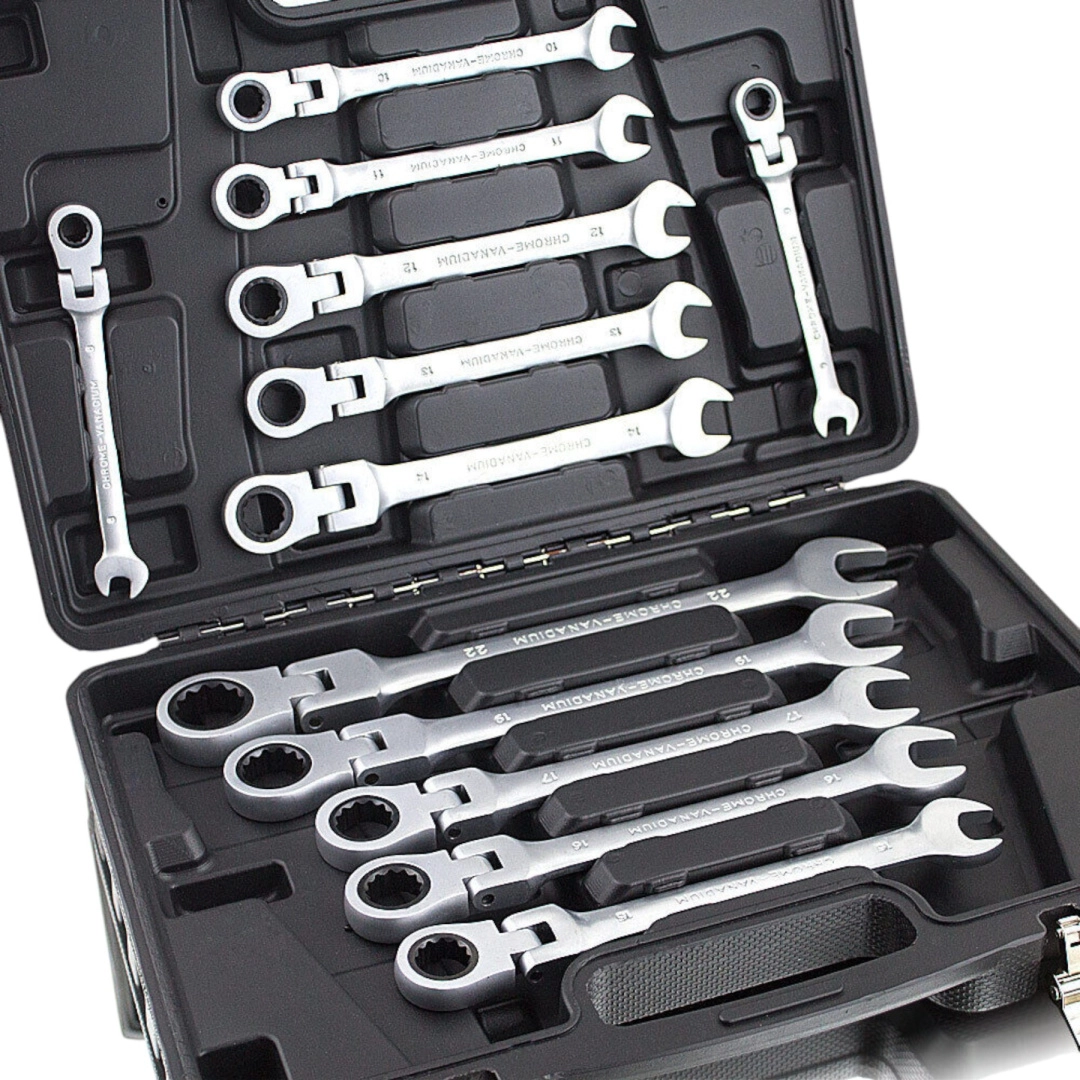 Uniwersalny zestaw kluczy płasko-oczkowych z grzechotką obejmuje najczęściej używane rozmiary metryczne i świetnie sprawdzi się zarówno u profesjonalistów, jak i domowych majsterkowiczów. Grzechotka w oczku umożliwia płynne odkręcanie i dokręcanie bez ciągłego przekładania klucza, co oszczędza czas i ułatwia pracę w ciasnych miejscach.