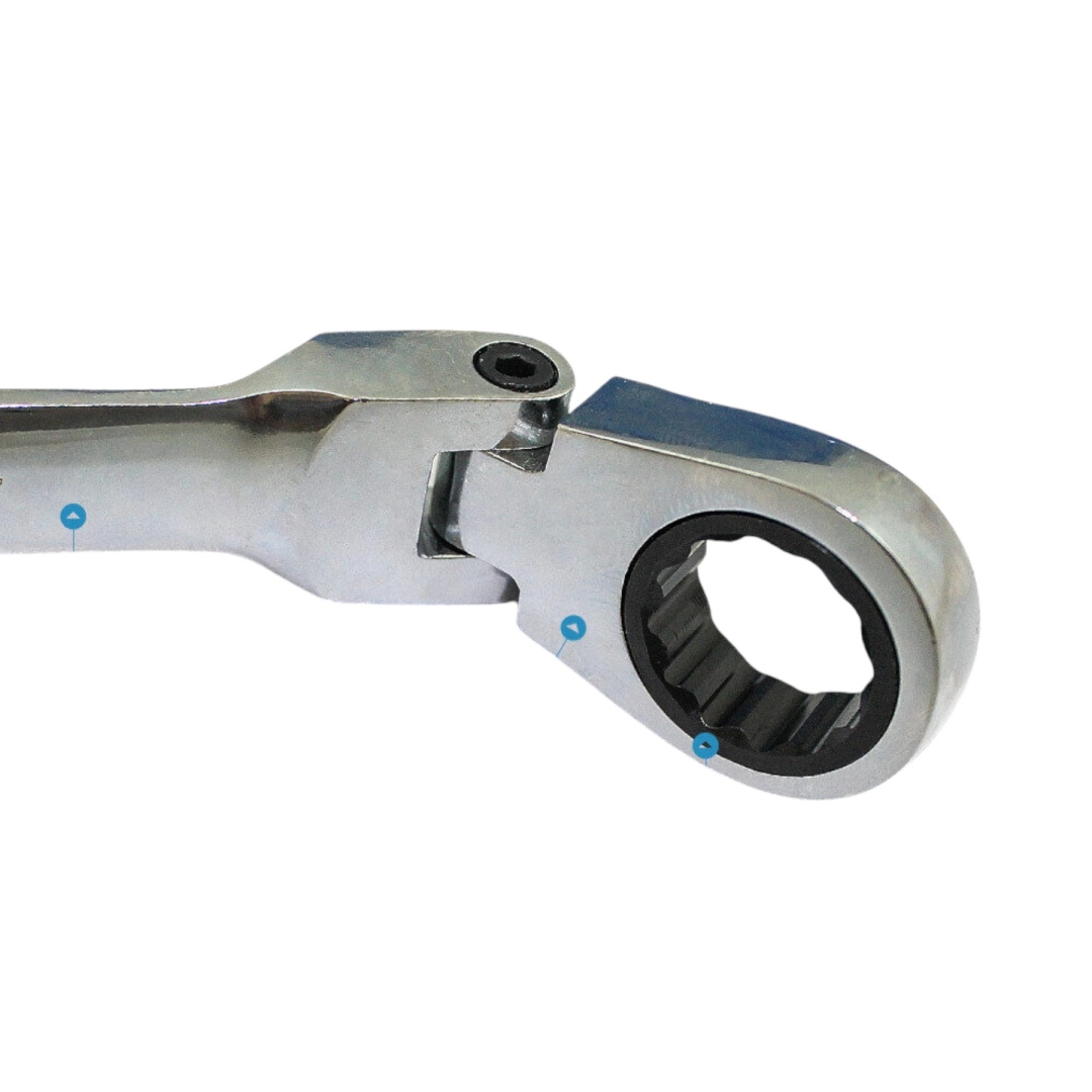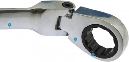 Oczko z drobnym skokiem grzechotki umożliwia dokręcanie i odkręcanie bez ciągłego przekładania klucza – idealne w ciasnych przestrzeniach.