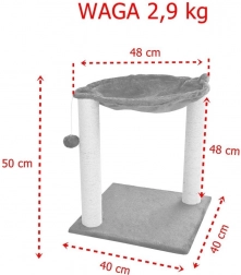 Hamakowe legowisko z drapakiem zaprojektowano do codziennego relaksu i radosnych chwil. Miękki, pluszowy koszyk zapewnia kotu przytulne miejsce do wypoczynku, a słupki owinięte sizalem wspierają zdrową pielęgnację pazurków i chronią Twój mebel. Wiszący pomponik na sznureczku rozbudzi instynkt łowiecki i utrzyma Twojego kota w ruchu.