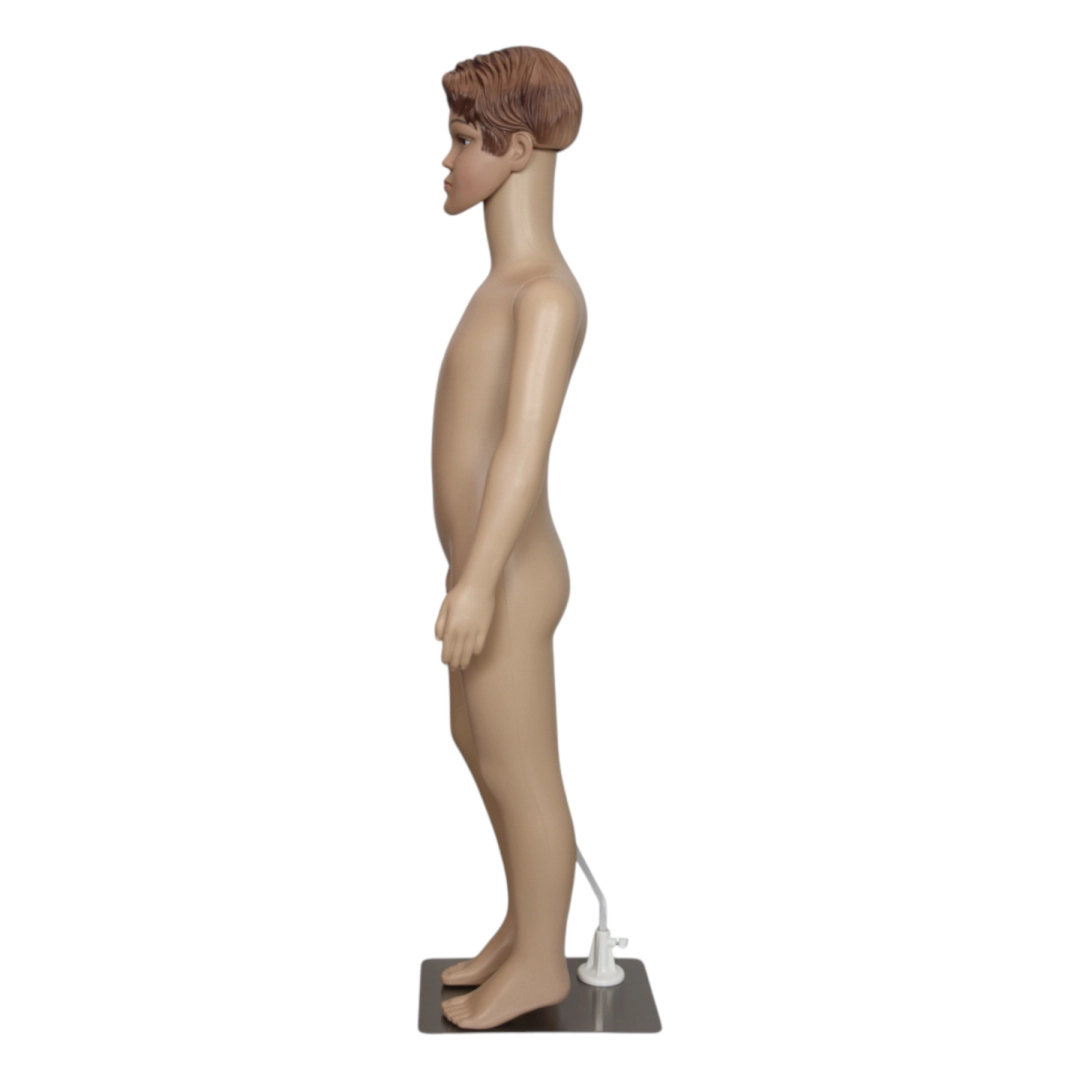Ten dziecięcy manekin o wysokości ok. 110 cm wyróżnia się naturalnym wyglądem – precyzyjnie uformowana twarz, włosy i dłonie przyciągają uwagę i zwiększają atrakcyjność ekspozycji. Wytrzymały polietylen jest lekki, solidny i łatwy w czyszczeniu, dzięki czemu świetnie sprawdza się w codziennym użytkowaniu w retailu.