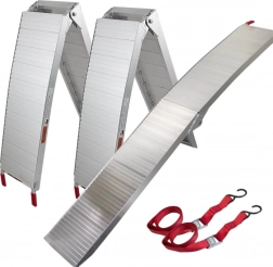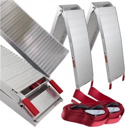 Radełkowana, antypoślizgowa powierzchnia i końcowe odboje zapewniają stabilność podczas najazdu także na mokro. W zestawie znajdują się również pasy do mocowania ramp do pojazdu.