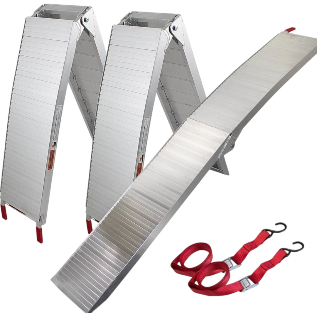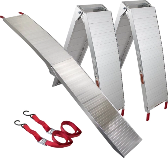 Po złożeniu rampy mają kompaktowe wymiary, dzięki czemu mieszczą się w bagażniku auta, warsztacie lub magazynie. W zestawie znajdziesz również pasy mocujące z hakami, które zapobiegają przesuwaniu ramp podczas załadunku. Świetny wybór do motocykli, skuterów, quadów, kosiarek, sprzętu ogrodowego i budowlanego, a w razie potrzeby także dla wózków inwalidzkich.