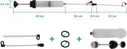 - Pompka 200 ml, 2× przewód PVC, 2× zapasowe uszczelnienie, 2× gumowy korek, 1× łącznik silikonowy