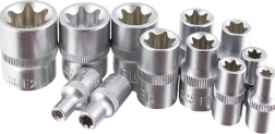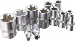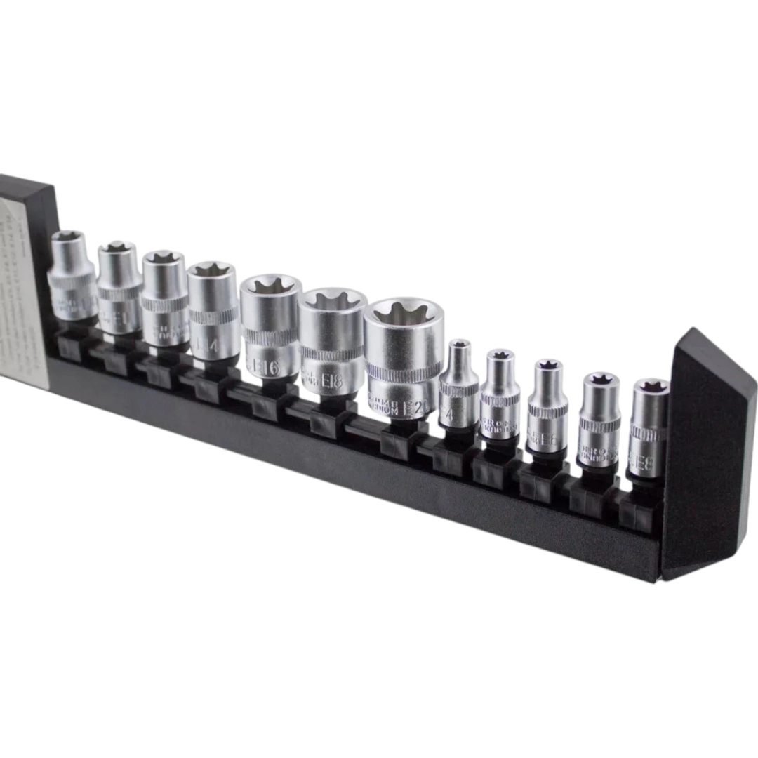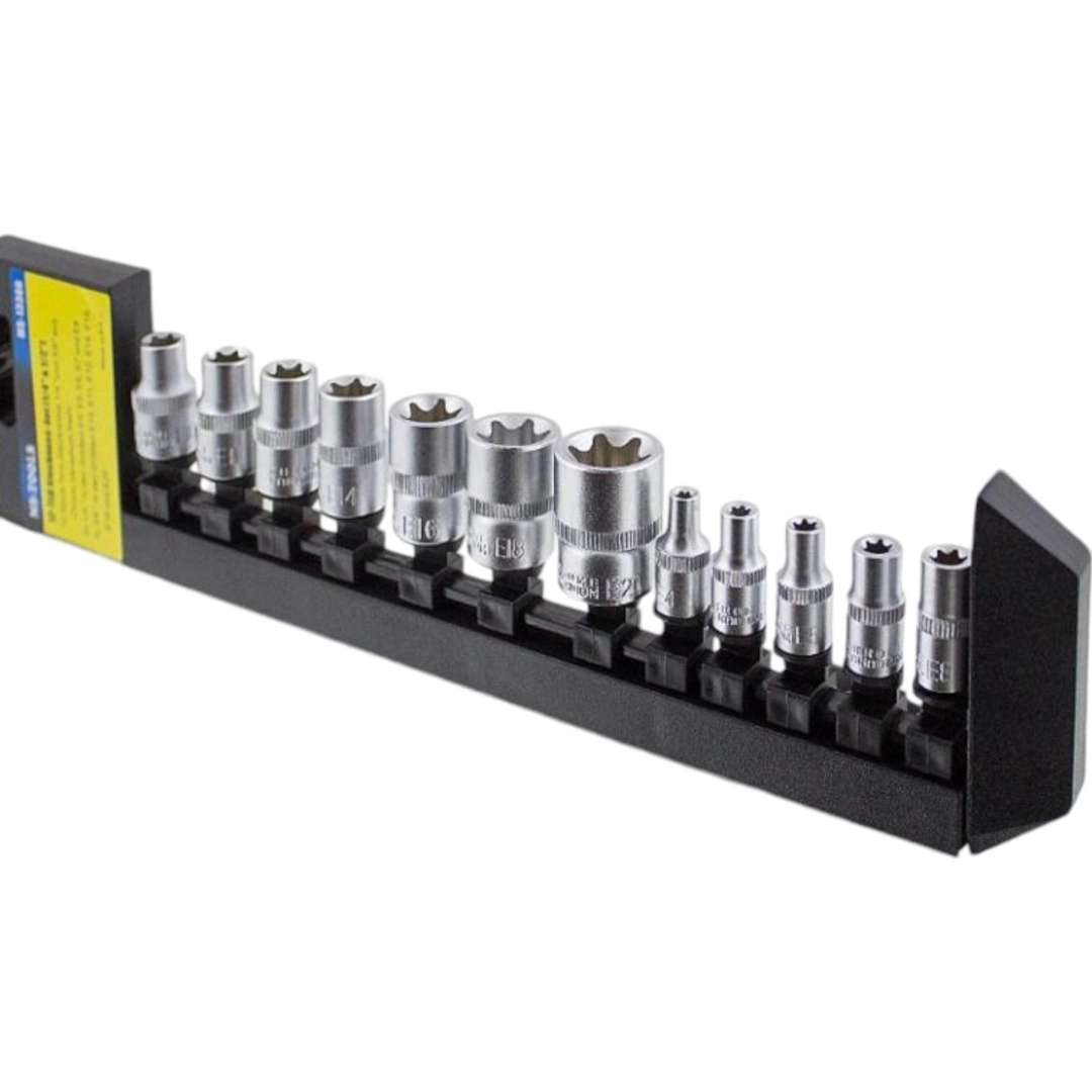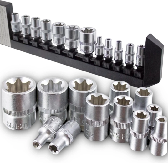 Zestaw obejmuje najczęściej używane rozmiary E‑Torx do szybkiego zastosowania przy naprawach samochodowych, montażu i konserwacji urządzeń.