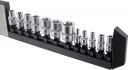 Listwa‑uchwyt utrzymuje nasadki razem, z wyraźnym oznaczeniem rozmiarów dla szybkiego wyboru i porządku w warsztacie.
