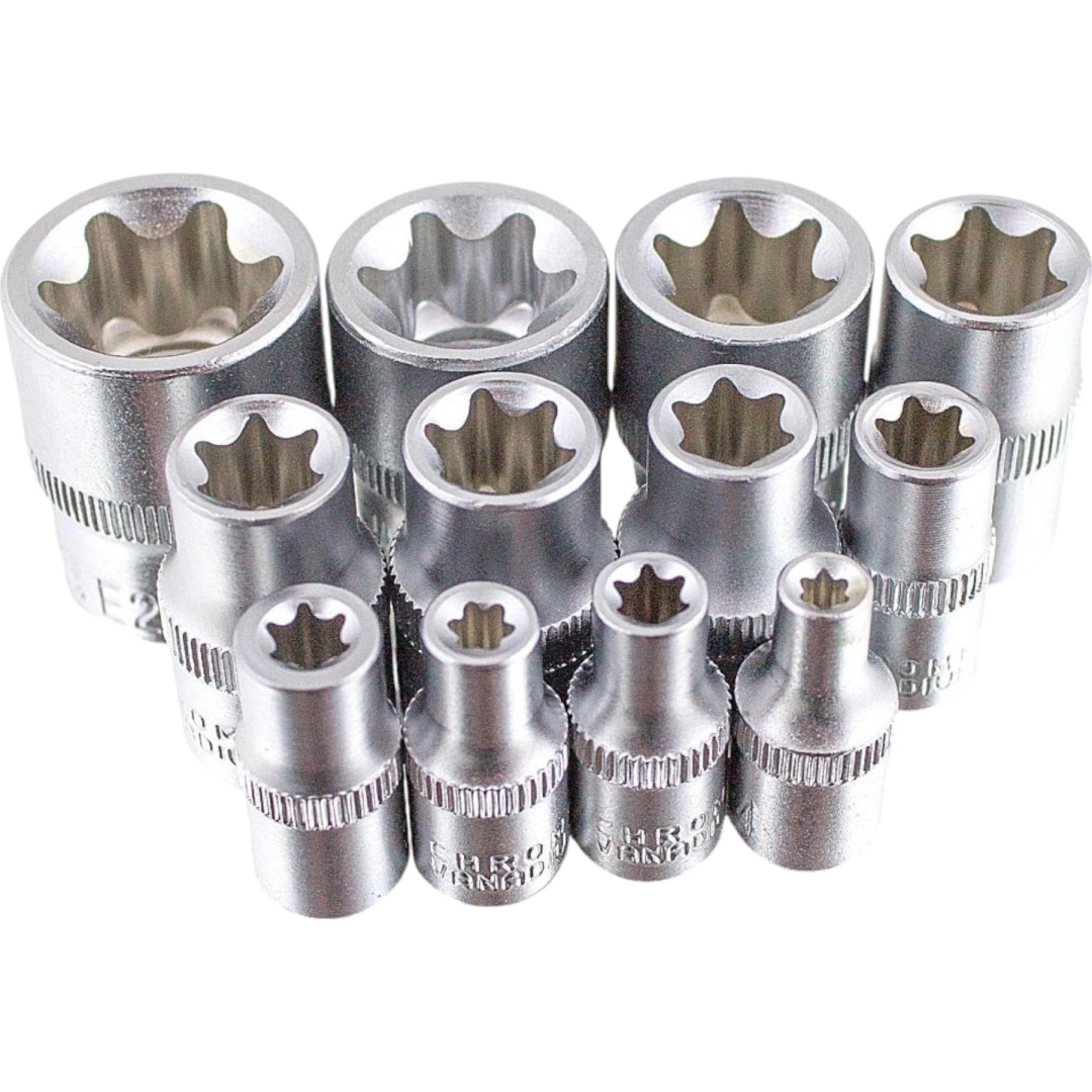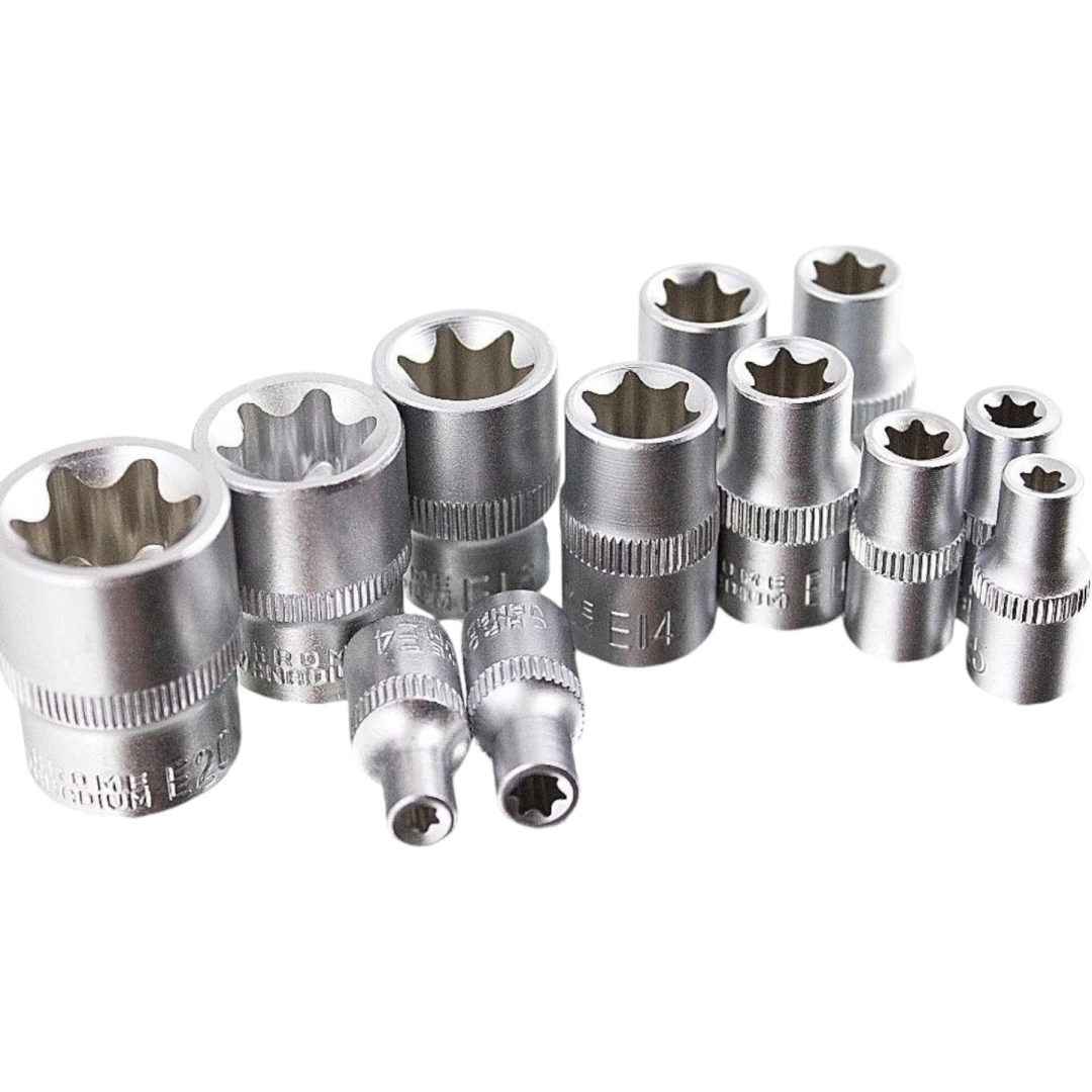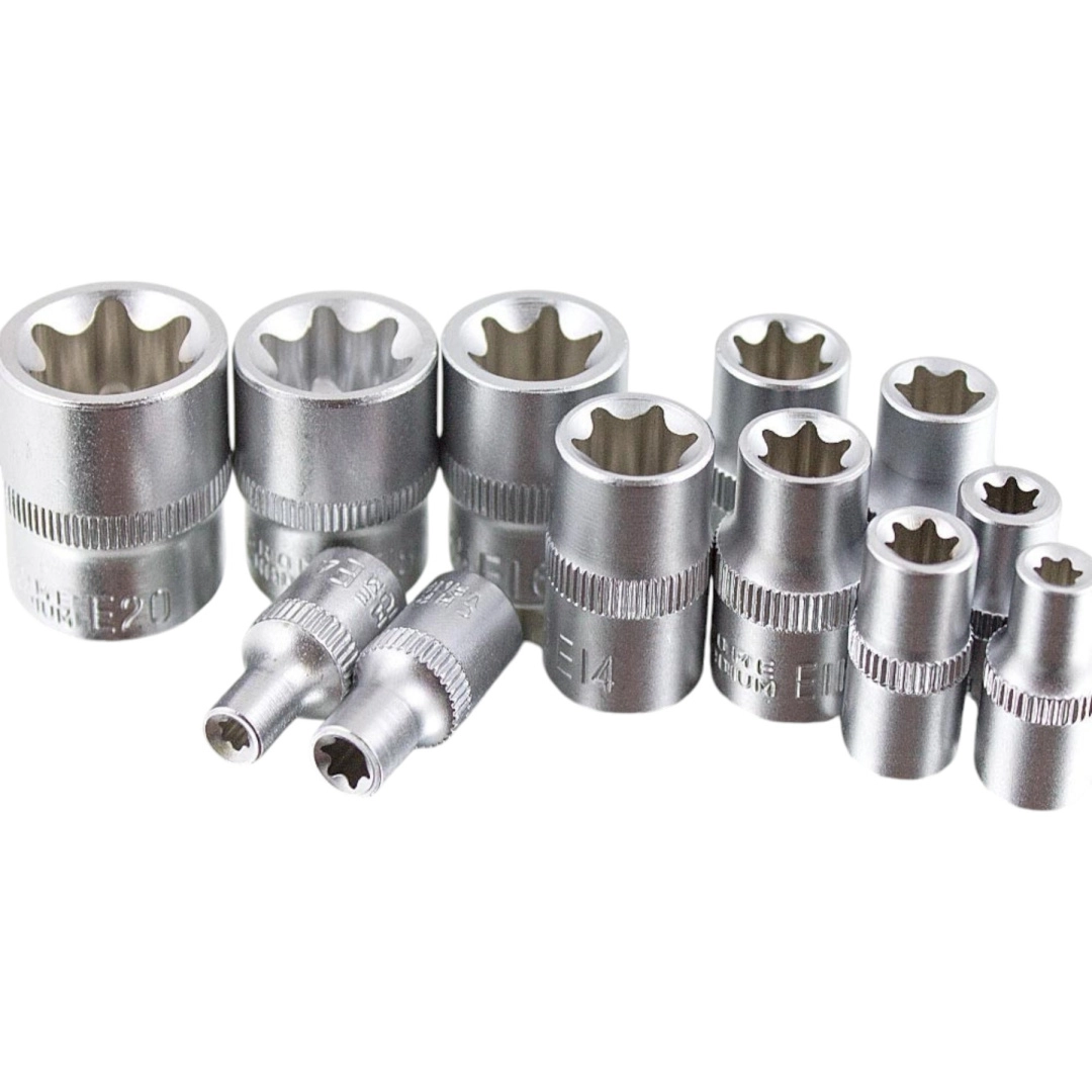 Profesjonalny zestaw 12 nasadek E‑Torx z wytrzymałej stali chromowo‑wanadowej (CR‑V) do precyzyjnej pracy w serwisie i domowym warsztacie. Oferuje szeroki zakres rozmiarów, wysoką odporność na zużycie i korozję oraz niezawodne przenoszenie siły do dokręcania i odkręcania śrub z zewnętrznym profilem Torx.