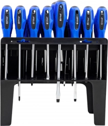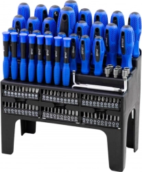 W zestawie jest wytrzymały stojak, który utrzymuje wszystko przejrzyście w jednym miejscu – od śrubokrętów i modeli zegarmistrzowskich po bity nasadowe i główki. Dzięki bogatemu wyposażeniu zestaw idealnie sprawdzi się w domu, garażu i profesjonalnym warsztacie.