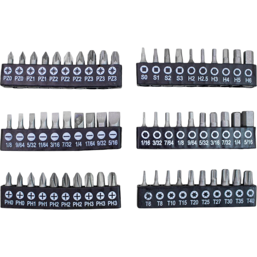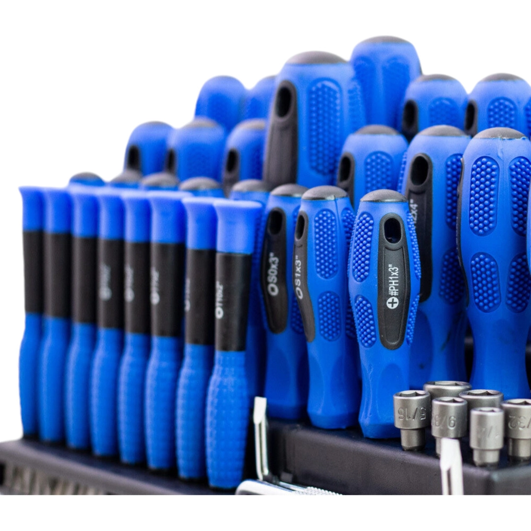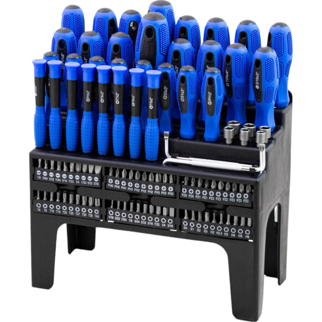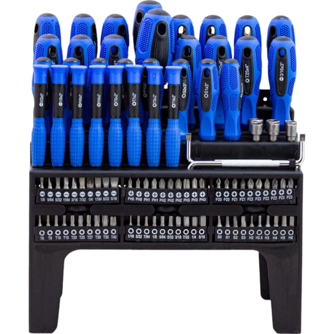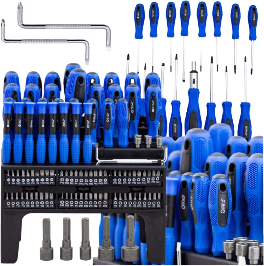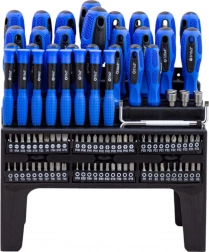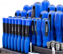 Ten uniwersalny zestaw 101 szt. łączy wszystko, czego potrzebujesz do montażu, konserwacji i napraw. Znajdziesz w nim bity krzyżowe, płaskie, TORX, kwadratowe i imbusowe, precyzyjne śrubokręty oraz rękojeść zapadkową do szybkiej pracy. Ergonomiczne, antypoślizgowe rękojeści zapewniają wygodne i precyzyjne wkręcanie, a magnetyczne groty niezawodnie trzymają śruby.