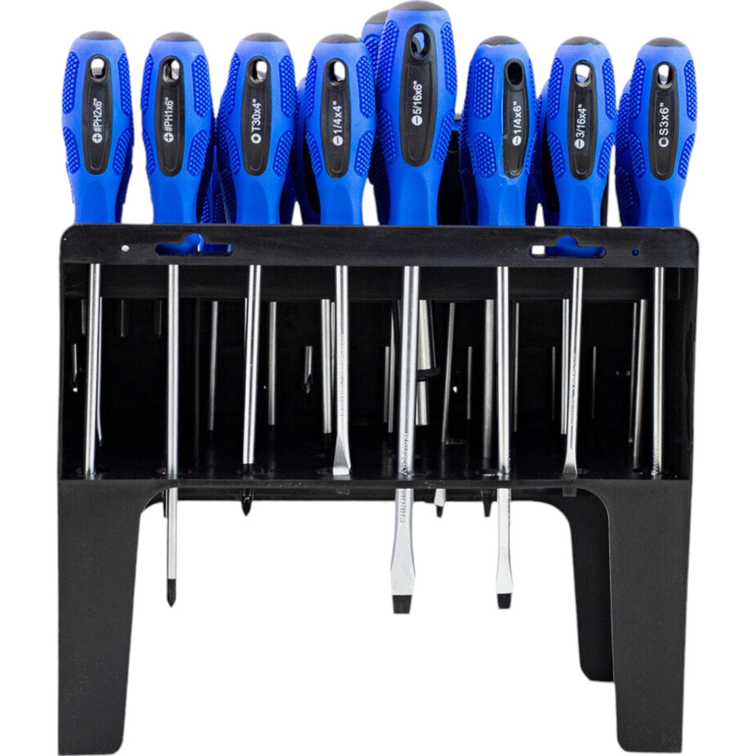 Stabilny organizer utrzymuje wszystkie śrubokręty, bity i nasadki w jednym miejscu. Szybko znajdziesz właściwe narzędzie i zaoszczędzisz czas.