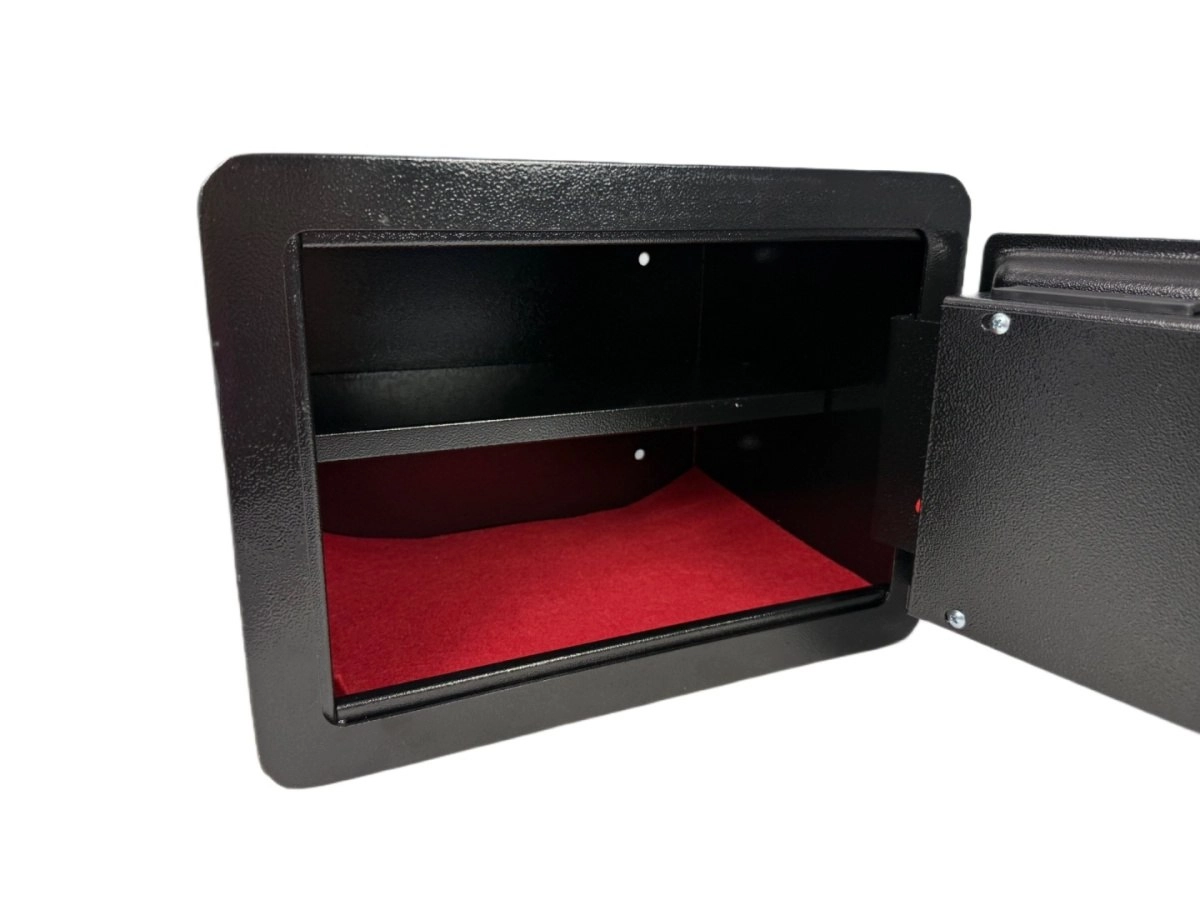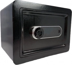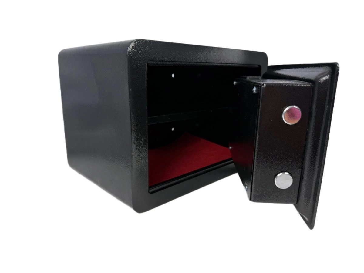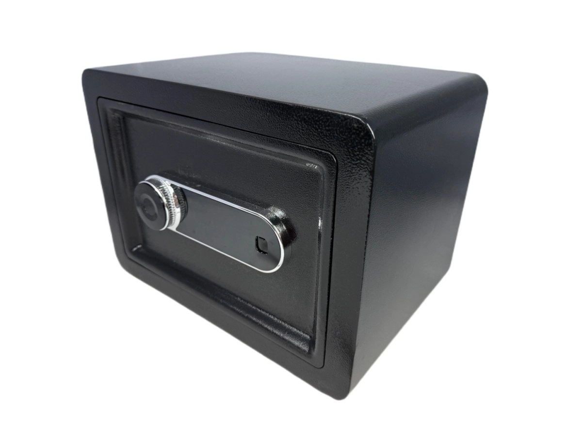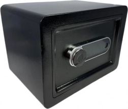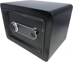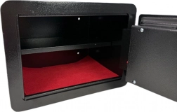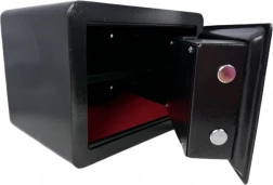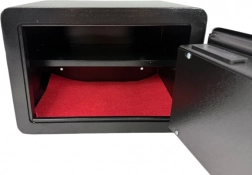 Maszyna stalowa z dwupunktowym ryglowaniem i możliwością stabilnego montażu do ściany zapewnia pewność i trwałość. Czarne, strukturalne wykończenie wygląda nowocześnie i dyskretnie, dzięki czemu sejf łatwo wkomponuje się w każde wnętrze.