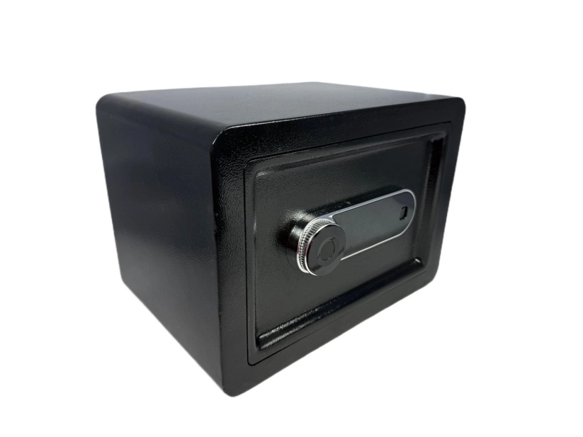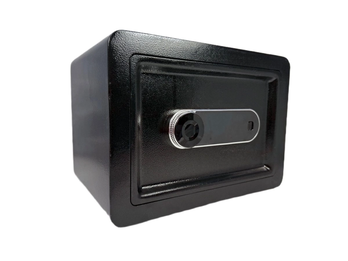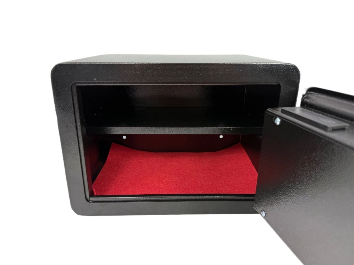 Maszyna stalowa z dwupunktowym ryglowaniem i możliwością stabilnego montażu do ściany zapewnia pewność i trwałość. Czarne, strukturalne wykończenie wygląda nowocześnie i dyskretnie, dzięki czemu sejf łatwo wkomponuje się w każde wnętrze.