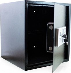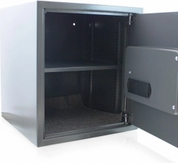 Wnętrze można dostosować dzięki wyjmowanej/regulowanej półce, więc przechowasz zarówno dokumenty, jak i drobne kosztowności. Automatyczna blokada po trzech błędnych próbach oraz stalowe ścianki (2 mm) i drzwi (3 mm) zapewniają wysoką odporność na próby siłowego otwarcia.