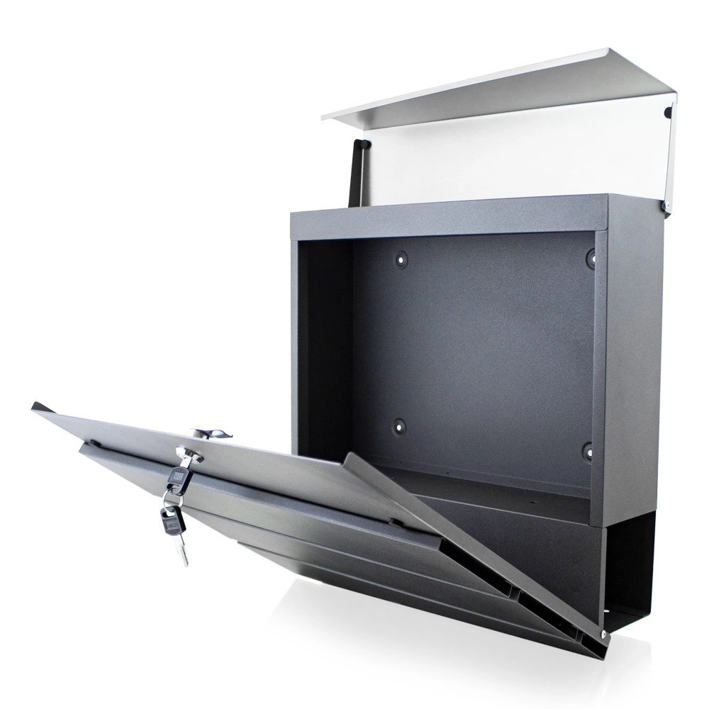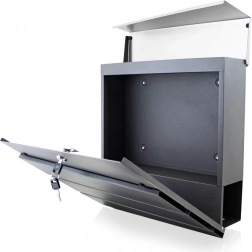Pokrywa chroni wrzut przed deszczem, a przednie zamykane drzwiczki z dużym wycięciem ułatwiają wyjmowanie zawartości. Skrzynkę montuje się bezpośrednio do ściany, a wszystko, co potrzebne, w tym kołki i śruby, znajduje się w opakowaniu.