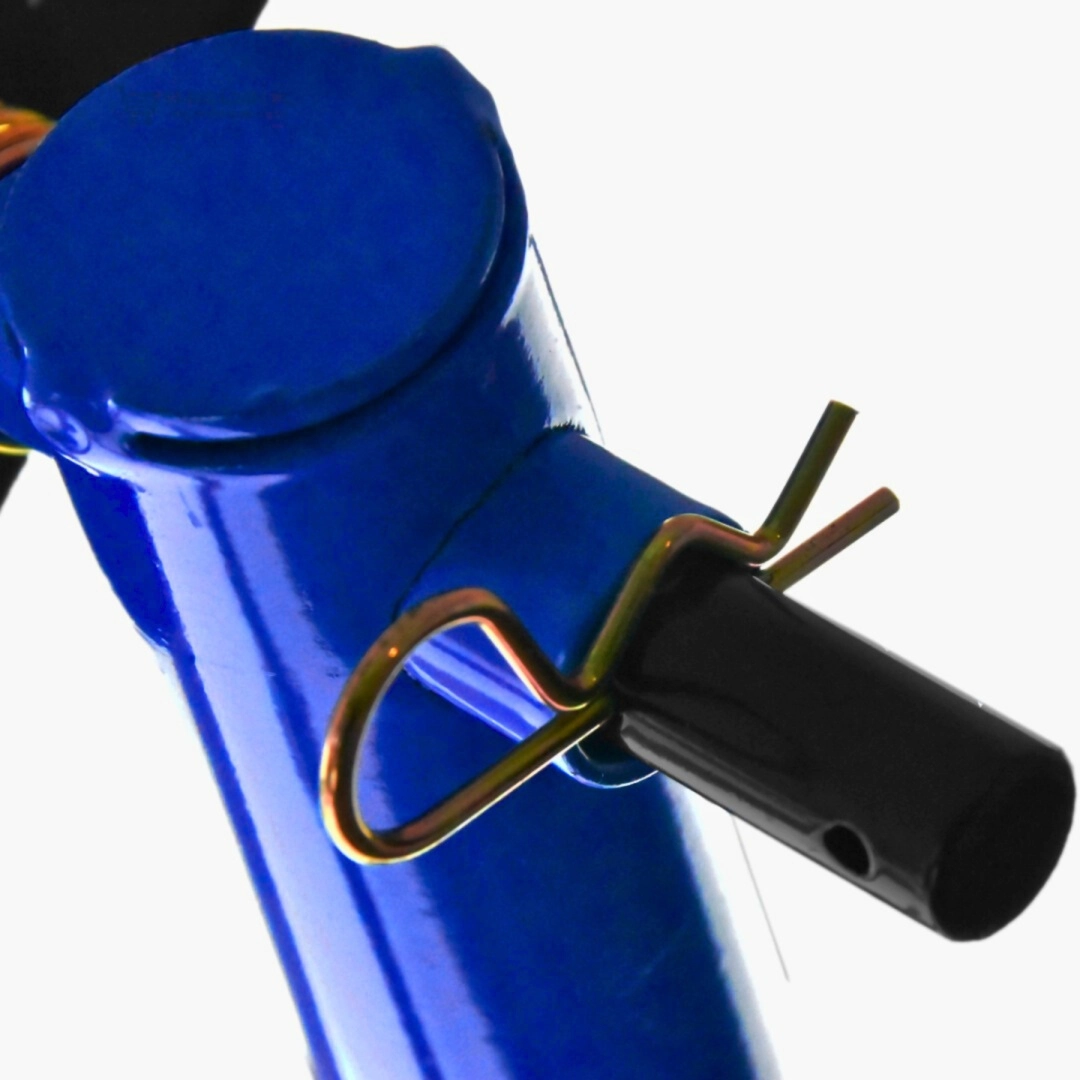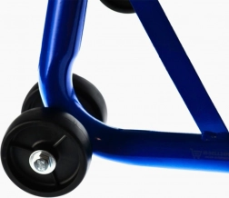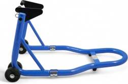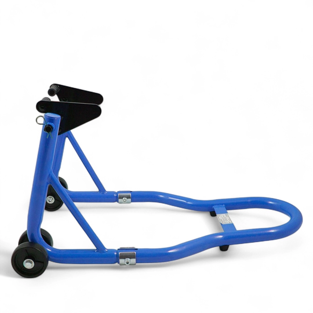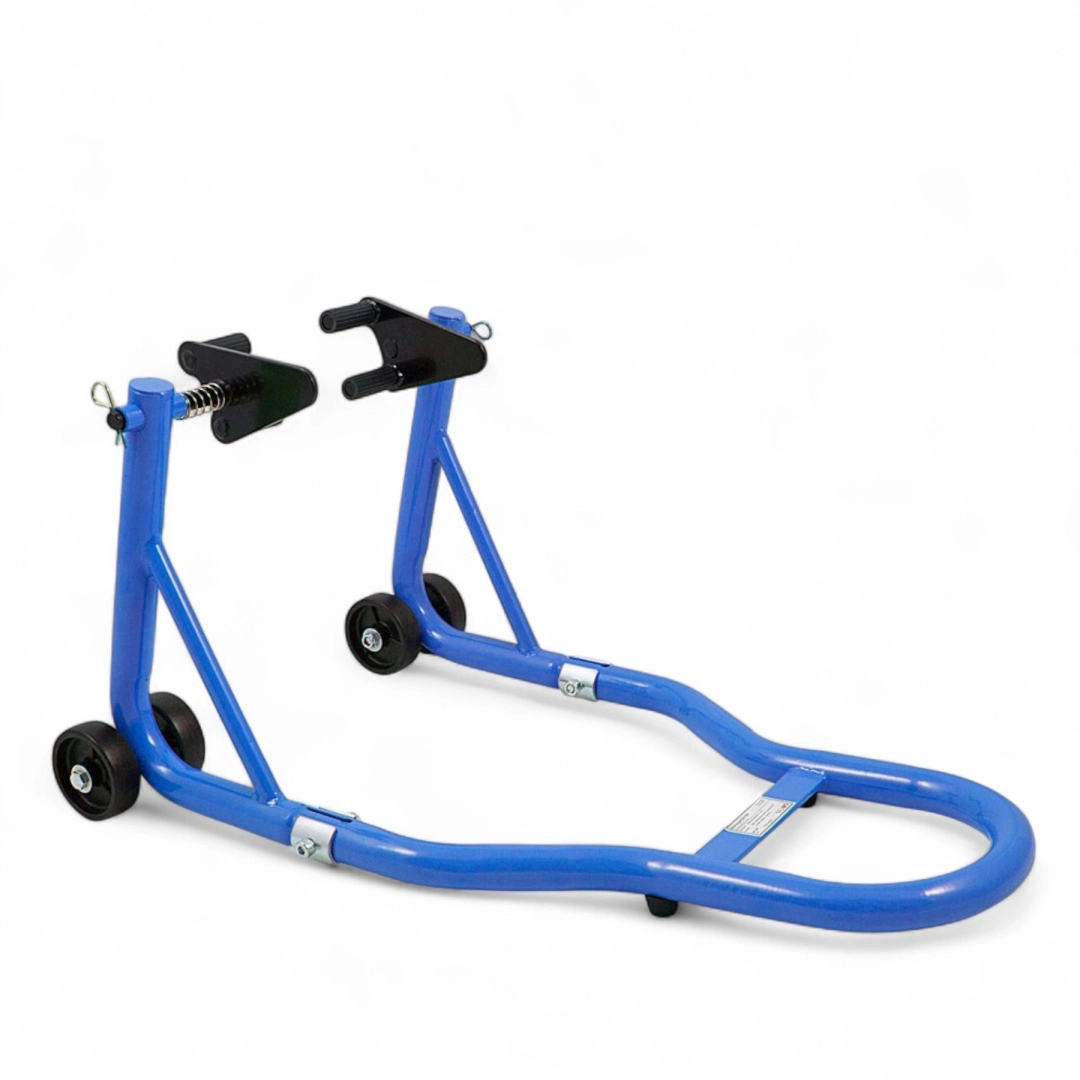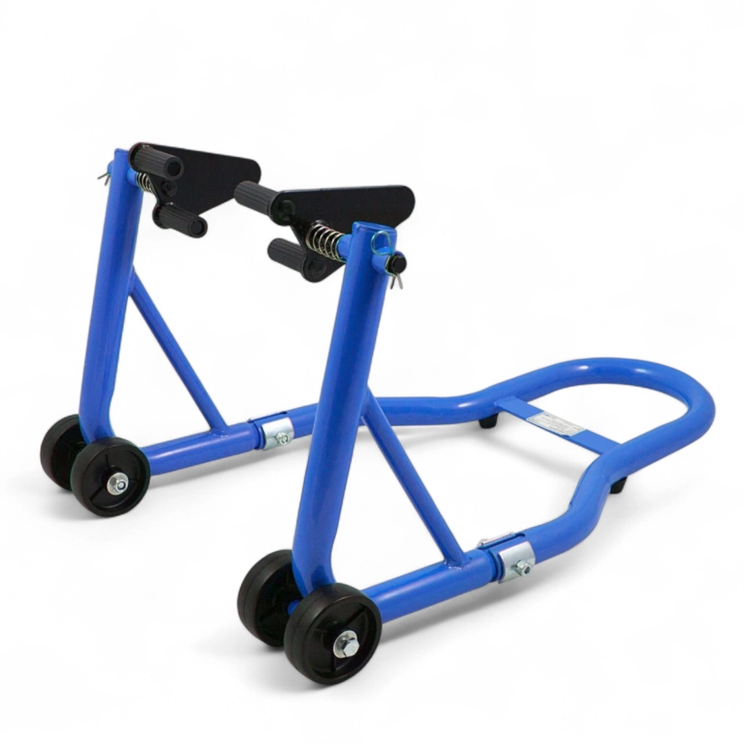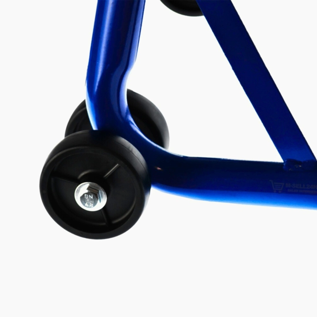 Stojak oferuje szybką regulację, a dzięki zakresowi 21–26 cm doskonale pasuje do większości motocykli. Udźwig 250 kg poradzi sobie także z cięższymi maszynami, a niebieska powłoka jest odporna na korozję i codzienne zużycie.