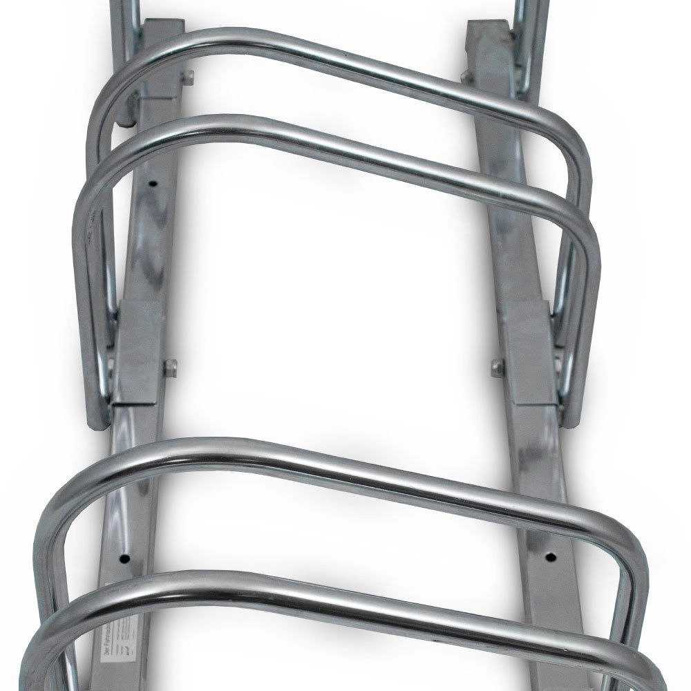 Stabilne stalowe łuki i solidne łączenia pewnie utrzymują rowery w pozycji pionowej. Cynkowanie galwaniczne zwiększa odporność na korozję i zużycie.