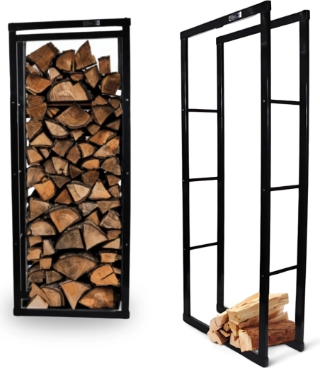 Głębokość jedynie 25 cm umożliwia ustawienie przy ścianie bez ograniczania przejścia. Wysoka konstrukcja mieści zapas drewna na kilka dni.