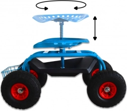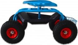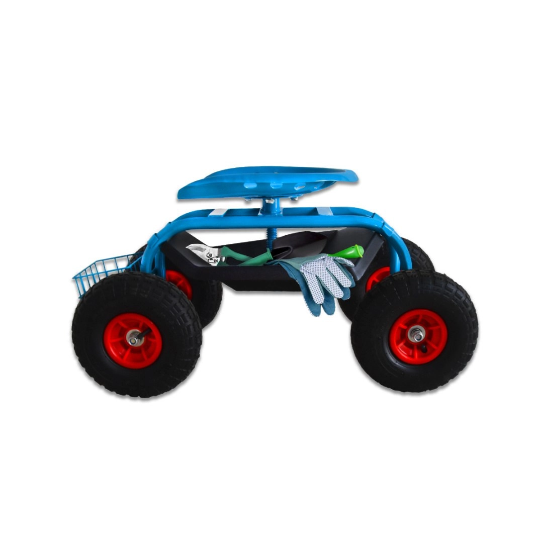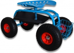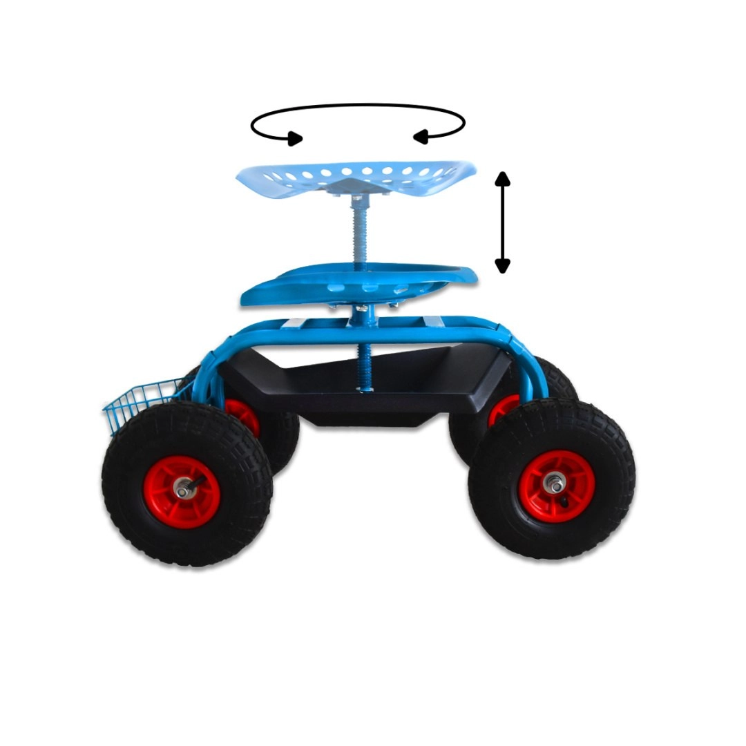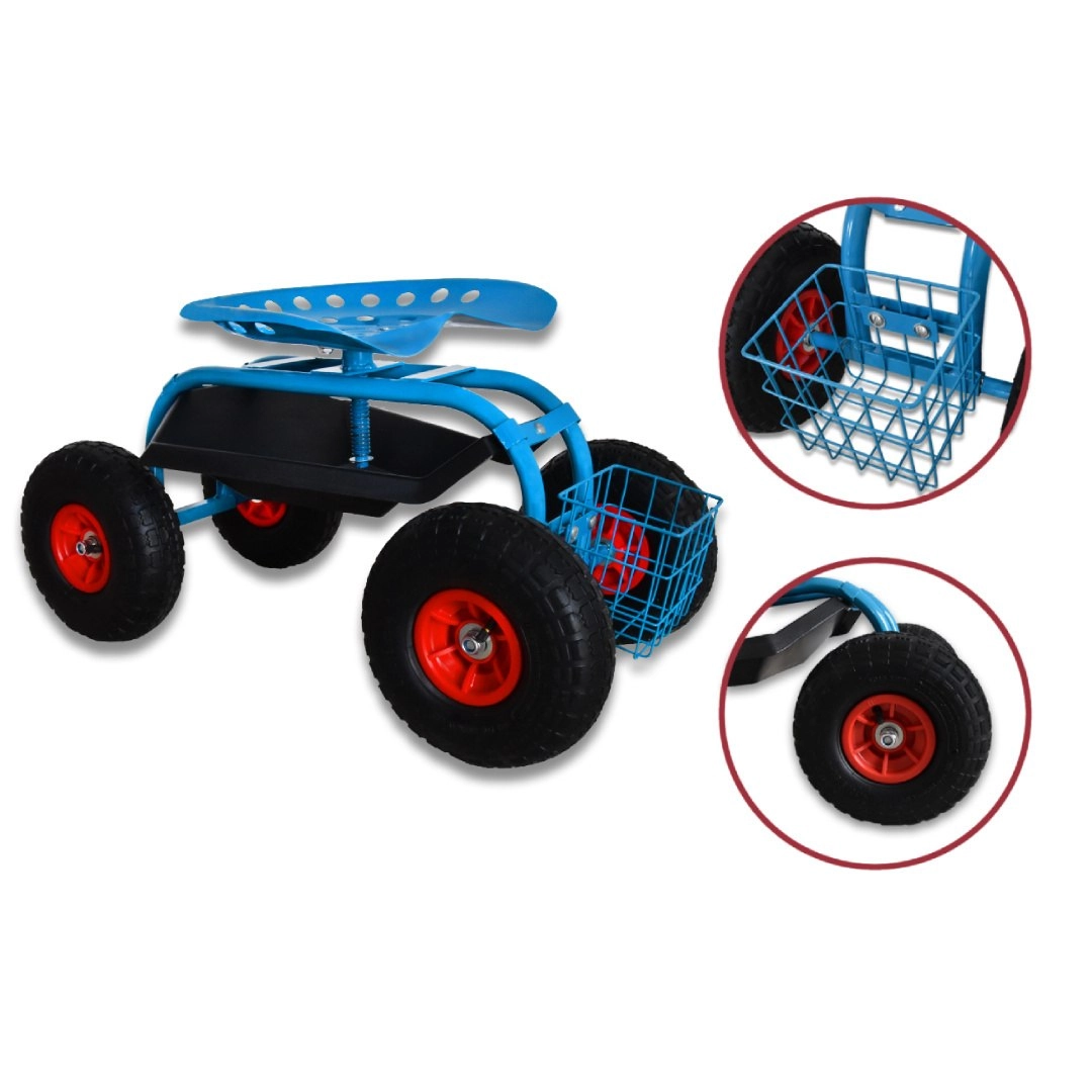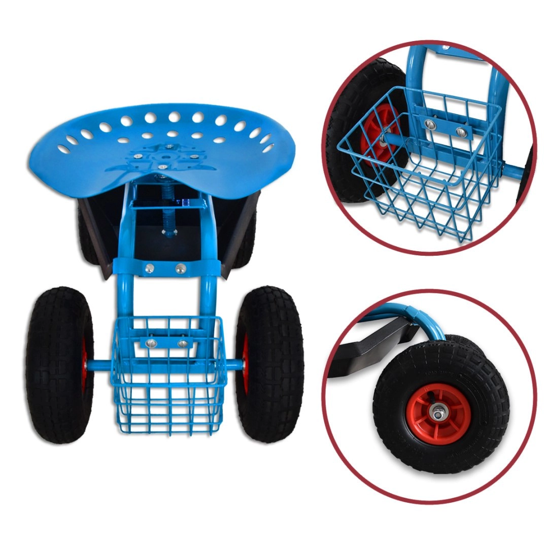 Cztery duże koła pneumatyczne z bieżnikiem antypoślizgowym zapewniają gładki ruch po trawniku i nierównej nawierzchni. Siedzisko typu „traktor” z metalu oraz solidna stalowa rama gwarantują stabilność i wysoką nośność do 150 kg. Pod siedziskiem znajdziesz praktyczną tackę na drobiazgi, a z przodu/drążkowy koszyk na narzędzia – wszystko masz zawsze pod ręką.