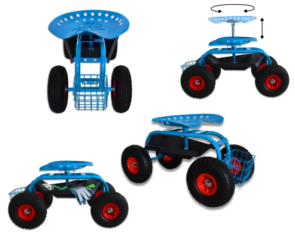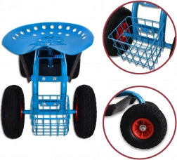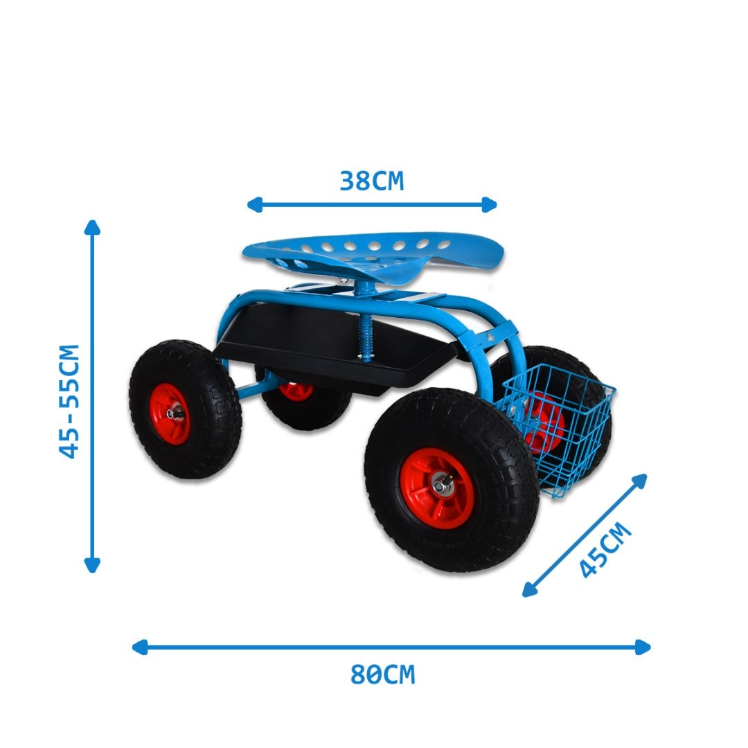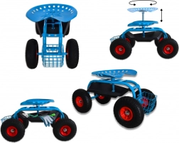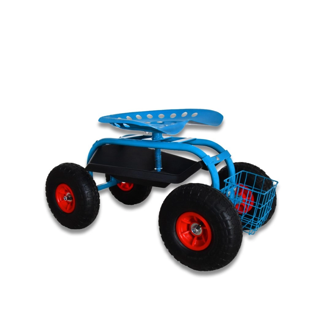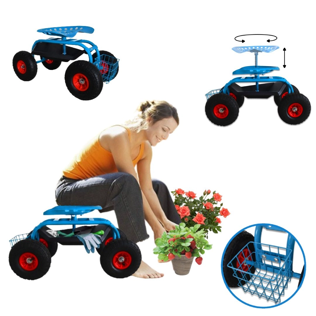 Cztery duże koła pneumatyczne z bieżnikiem antypoślizgowym zapewniają gładki ruch po trawniku i nierównej nawierzchni. Siedzisko typu „traktor” z metalu oraz solidna stalowa rama gwarantują stabilność i wysoką nośność do 150 kg. Pod siedziskiem znajdziesz praktyczną tackę na drobiazgi, a z przodu/drążkowy koszyk na narzędzia – wszystko masz zawsze pod ręką.