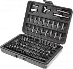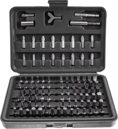Ten kompletny zestaw oferuje szeroką gamę końcówek – płaskie, krzyżowe PH i PZ, TORX i TORX z otworem, metryczne i calowe imbusy, bity zabezpieczające typu tri‑wing, spanner, Robertson (SQ), XZN i inne. Wytrzymała stal zapewnia długą żywotność i niezawodność przy montażu, serwisie i naprawach.