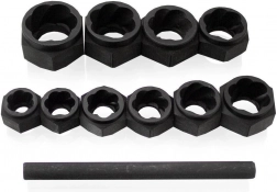 Każda wkładka wykonana jest z stali chromowo‑molibdenowej (Cr‑Mo) dla wysokiej wytrzymałości i długiej żywotności. Zewnętrzny sześciokąt umożliwia użycie klucza płaskiego/oczkowego lub grzechotki, a dołączony wybijak ułatwia wyjęcie śruby z nasadki. Całość jest przejrzyście ułożona w wytrzymałej plastikowej walizce dla łatwego przenoszenia i przechowywania.