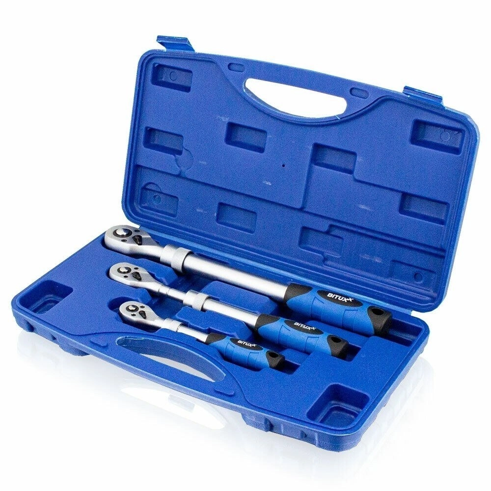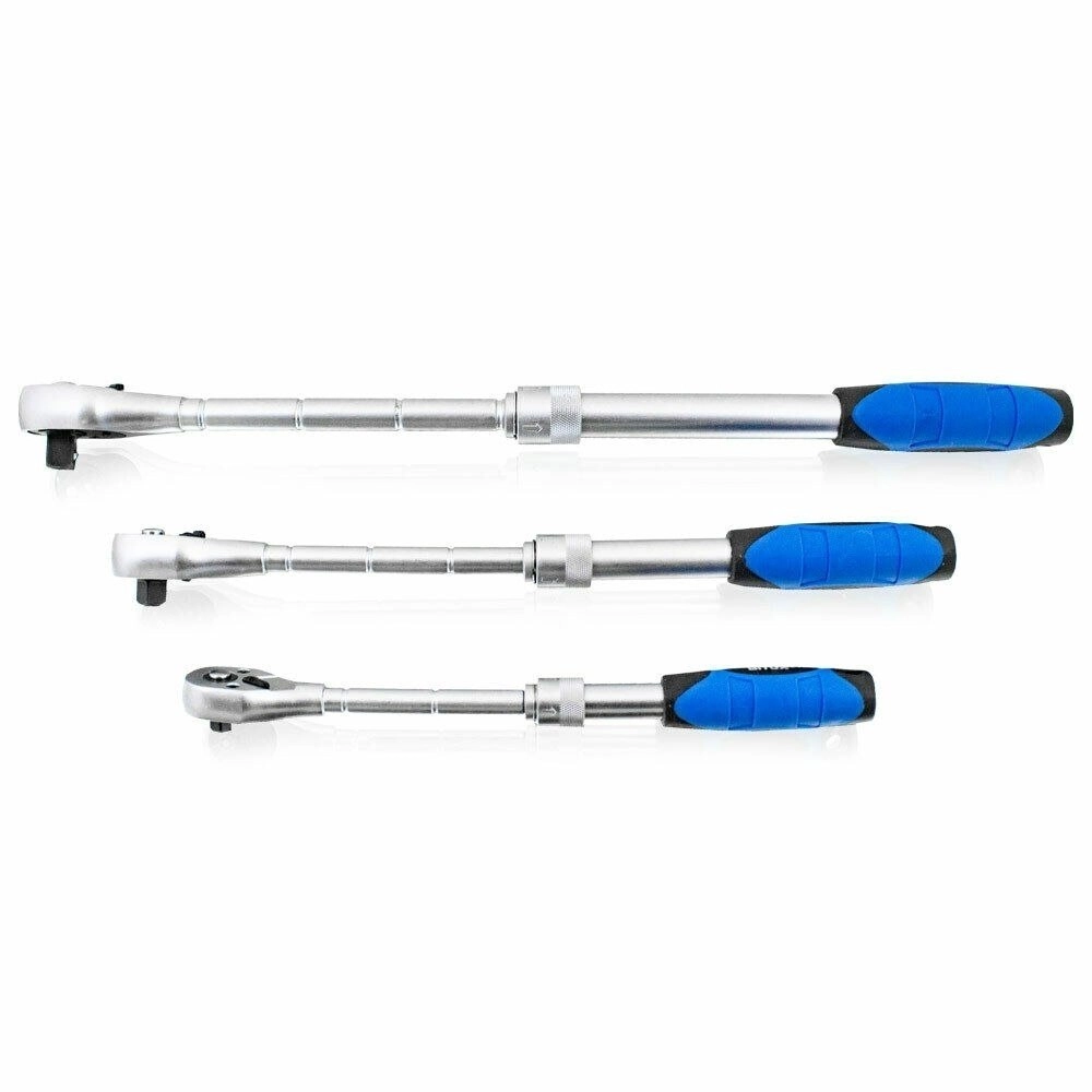 Praktyczny zestaw trzech teleskopowych grzechotek z napędami 1/4", 3/8" i 1/2" uzupełniony o trzy nasadki 17/19/21 mm w osłonach ochronnych. Dzięki regulowanej długości dla większej dźwigni, antypoślizgowym rękojeściom oraz wysokiej jakości stali Cr-V wykonasz pracę szybciej i bezpieczniej. W zestawie znajduje się wytrzymała walizka do przejrzystego przechowywania i łatwego transportu.