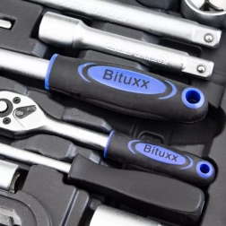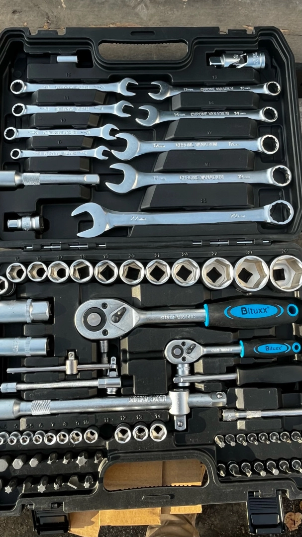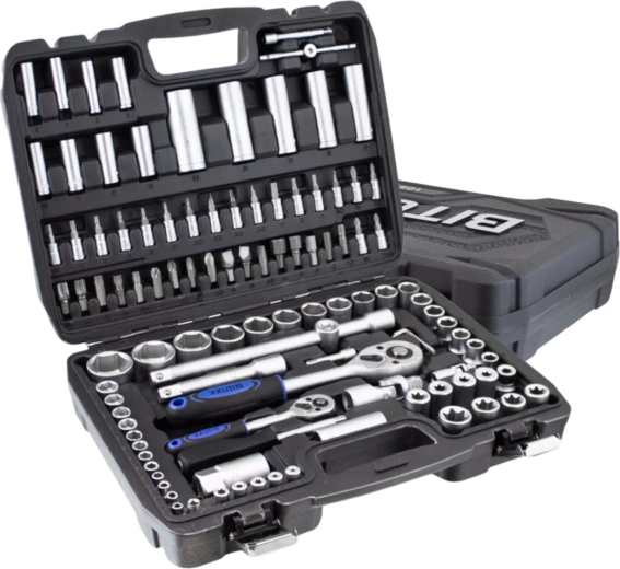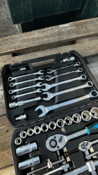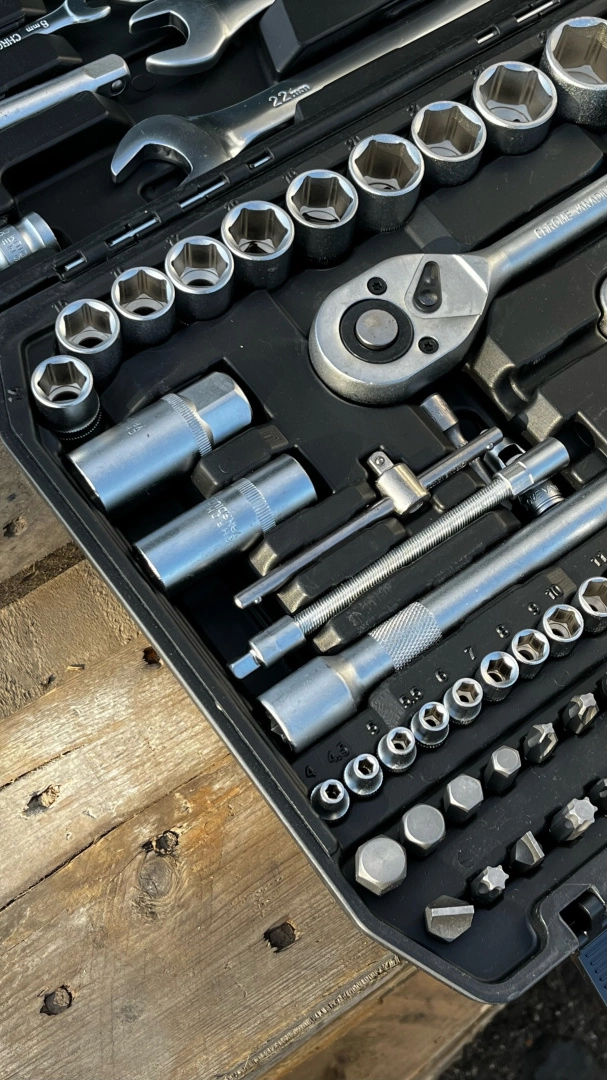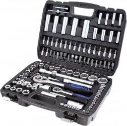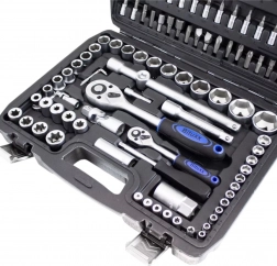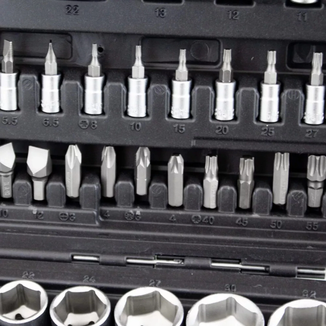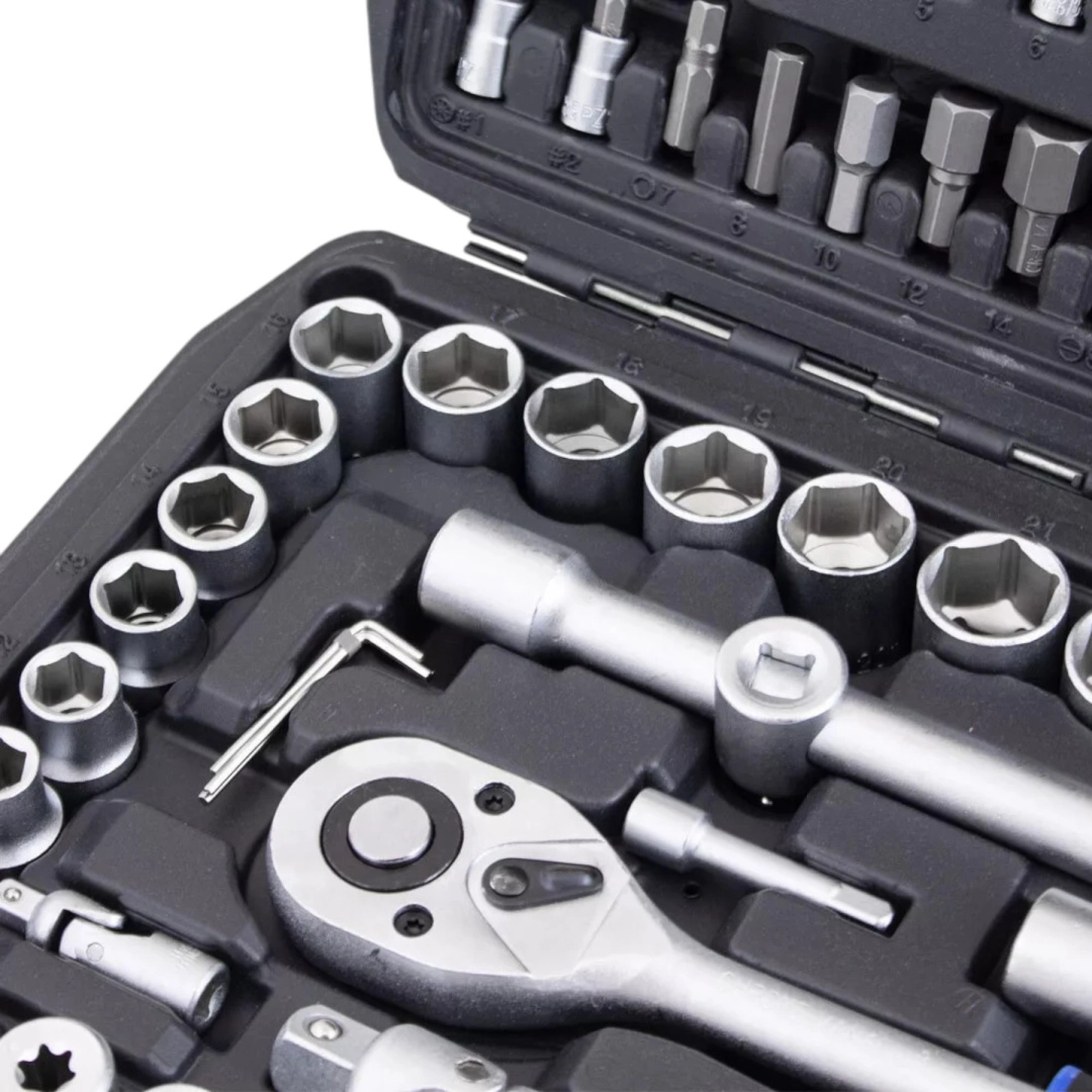 Wszystkie klucze, nasadki i bity wykonano ze stali chromowo‑wanadowej, która jest odporna na korozję i wysokie obciążenia, zapewniając niezawodną pracę przy codziennym użytkowaniu.