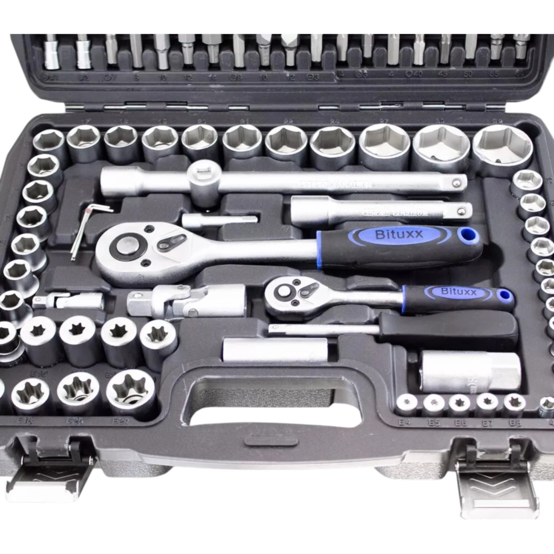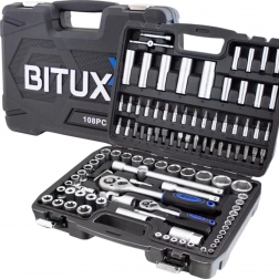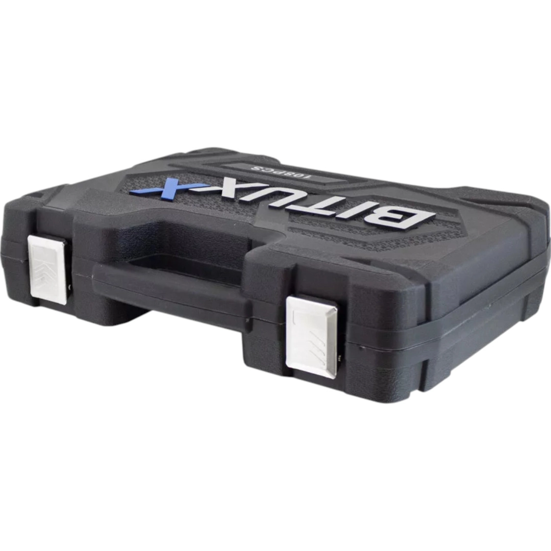 Ten uniwersalny zestaw 108 elementów obejmuje nasadki w standardowych i długich długościach, bity, nasadki torx E, przedłużki, przeguby oraz praktyczne akcesoria. Dzięki ergonomicznym grzechotkom i precyzyjnie obrabianym główkom poradzisz sobie z naprawami od samochodów po domowe montaże.