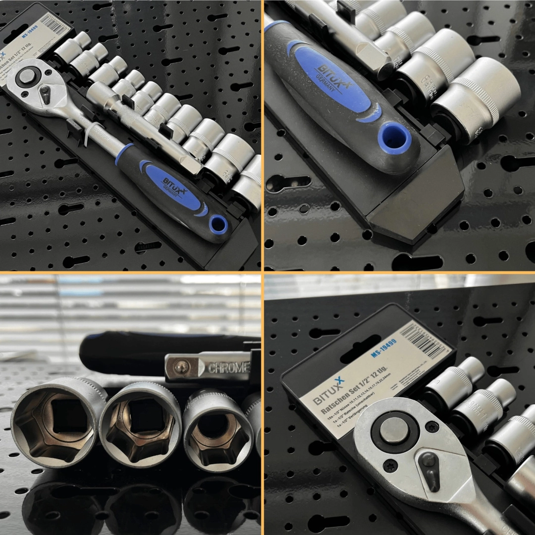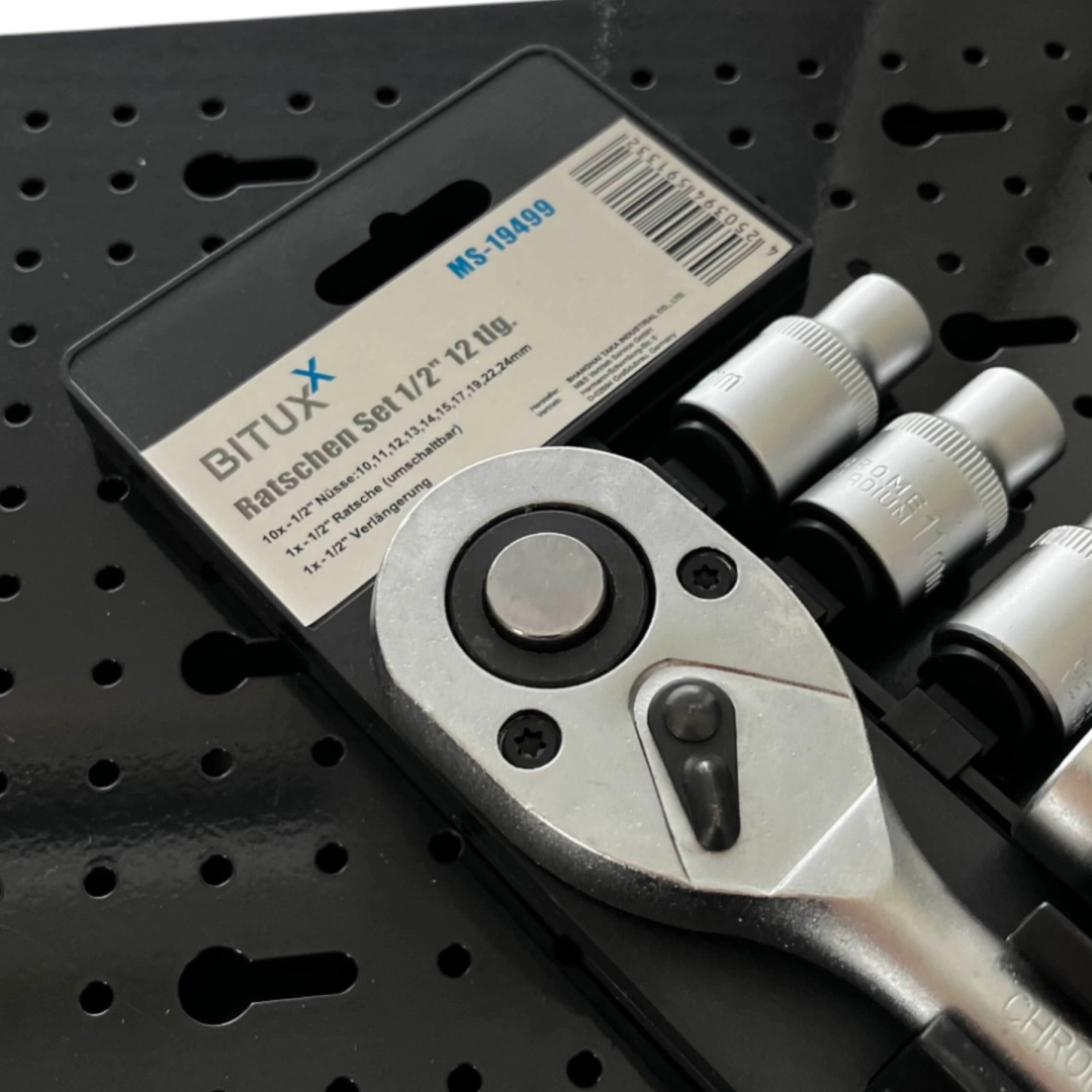 Szybkie przełączanie kierunku grzechotki oraz wybór z dziesięciu najczęściej używanych rozmiarów 10–24 mm pokrywa większość połączeń śrubowych. Przedłużka 125 mm ułatwia dostęp do trudno dostępnych miejsc, a praktyczna listwa utrzymuje wszystkie elementy w porządku i na swoim miejscu.