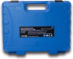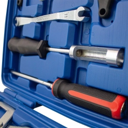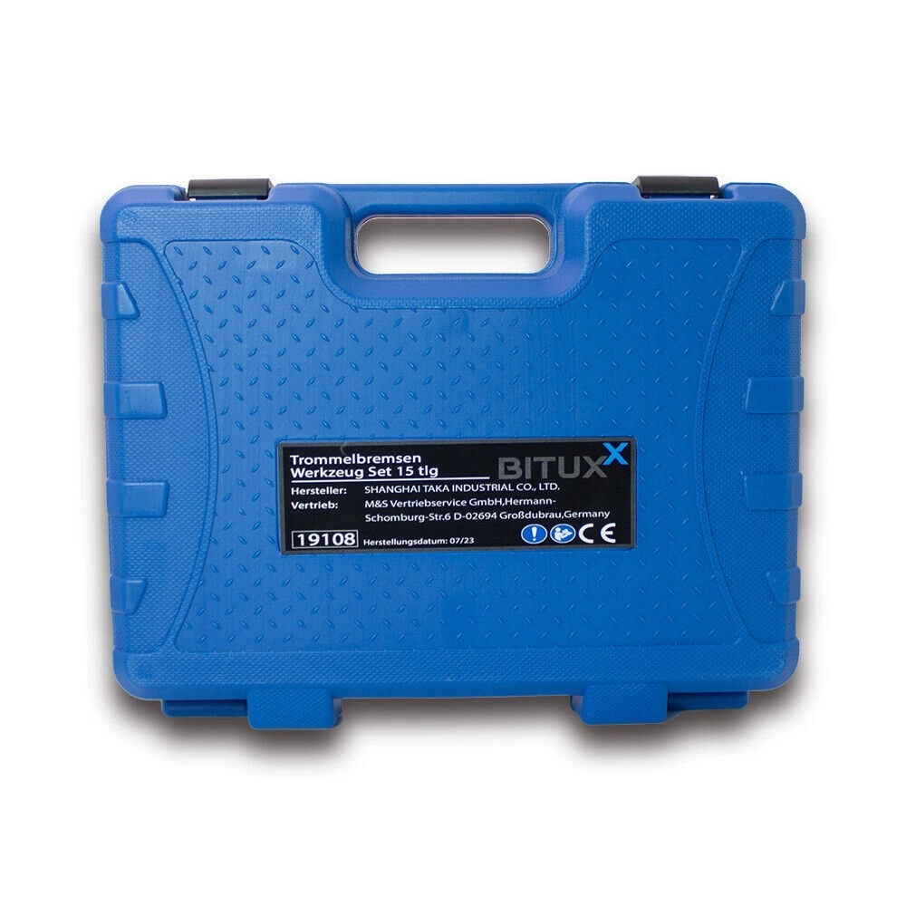 Narzędzia są przejrzyście ułożone w solidnej plastikowej walizce z uchwytem i zatrzaskami, dzięki czemu są zawsze pod ręką i dobrze chronione. Zestaw obejmuje najczęstsze czynności przy hamulcach bębnowych – od pracy ze sprężynami, przez czyszczenie szczęk, po obsługę przewodów hamulcowych.
