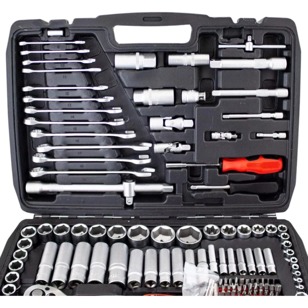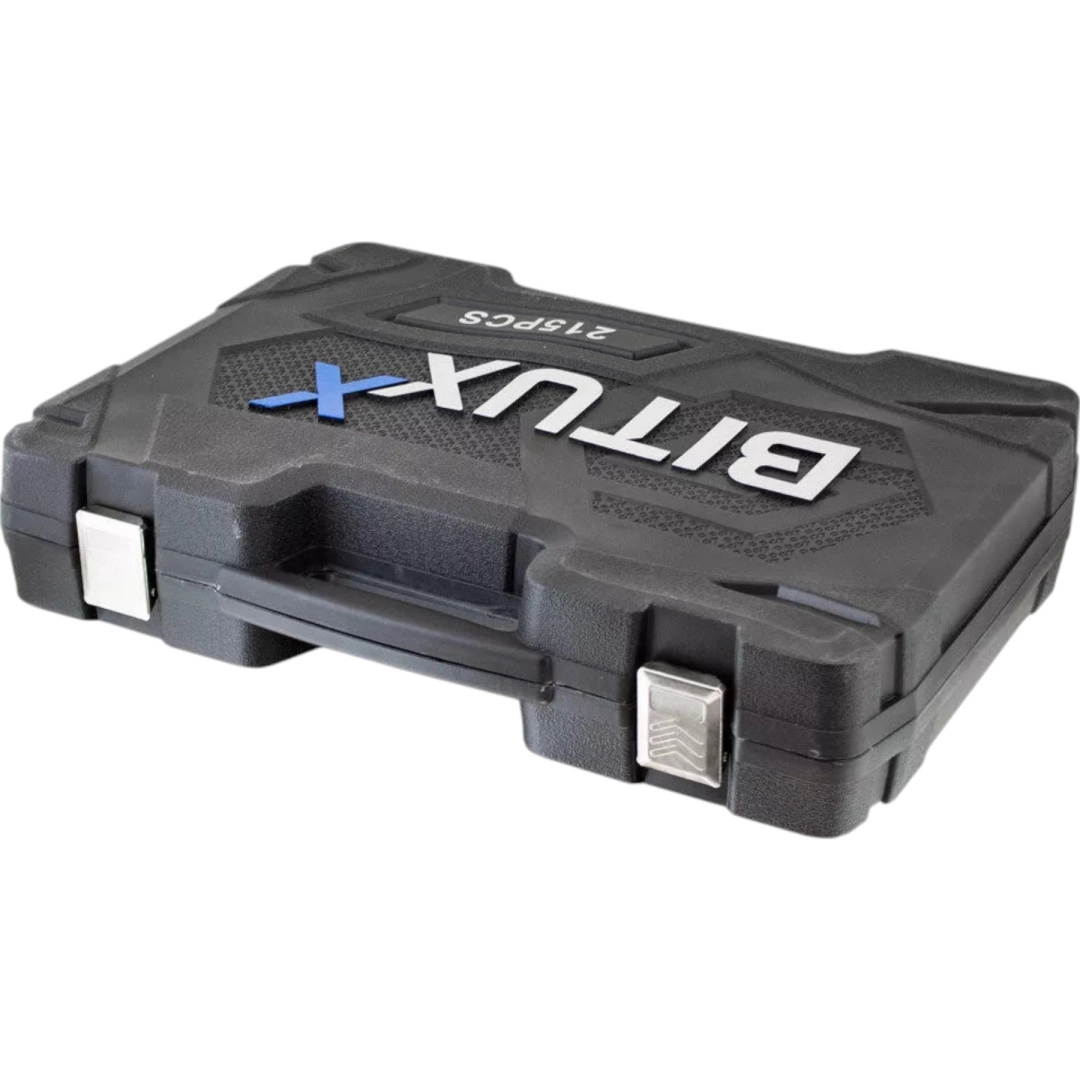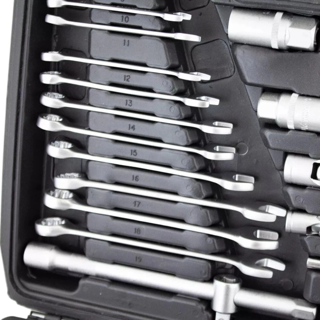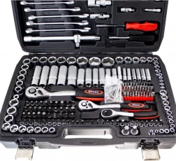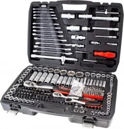 Kompletny zestaw narzędzi z 215 elementami do warsztatu i domu. Zawiera nasadki, grzechotki, bity, imbusy, klucze oraz przedłużki. Wykonany z stali chromowo‑wanadowej (CrV) dla wysokiej odporności i długiej żywotności. Wszystko czytelnie ułożone w solidnej przenośnej walizce.