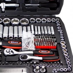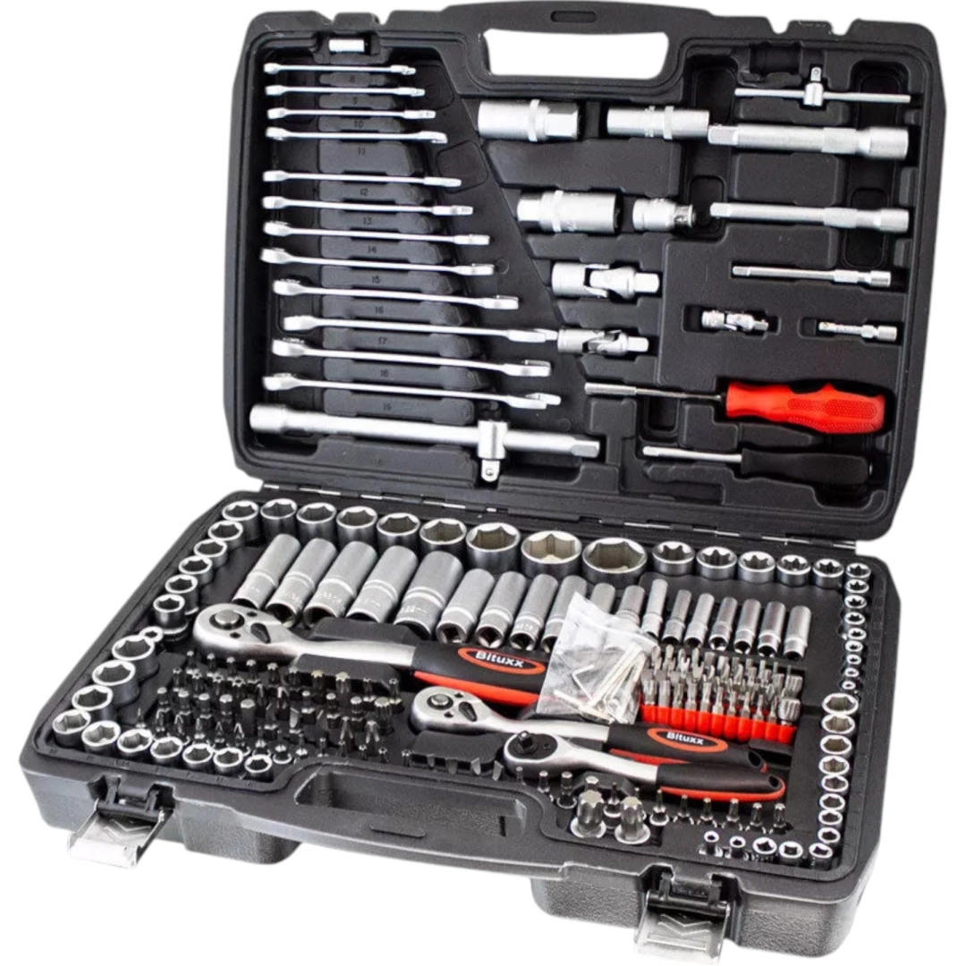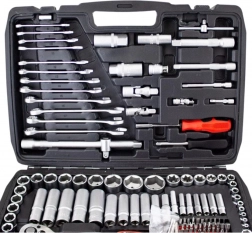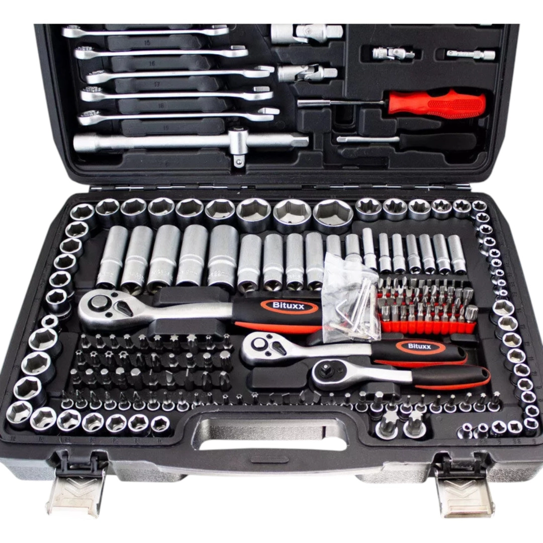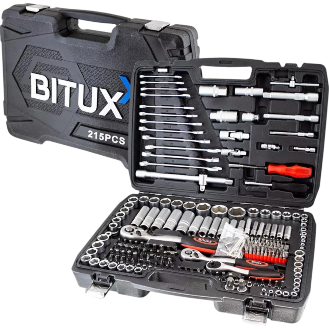 Kompletny zestaw narzędzi z 215 elementami do warsztatu i domu. Zawiera nasadki, grzechotki, bity, imbusy, klucze oraz przedłużki. Wykonany z stali chromowo‑wanadowej (CrV) dla wysokiej odporności i długiej żywotności. Wszystko czytelnie ułożone w solidnej przenośnej walizce.
