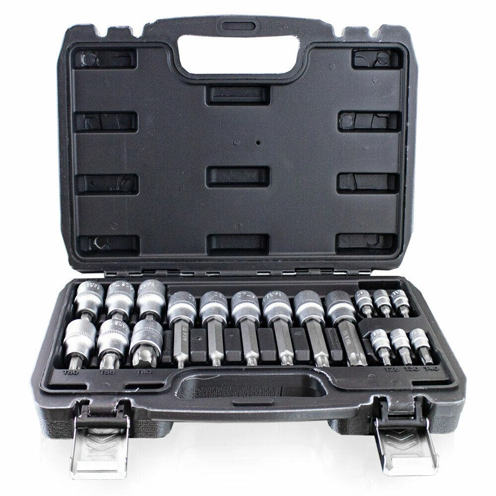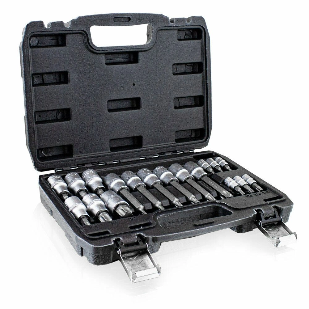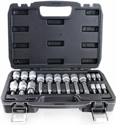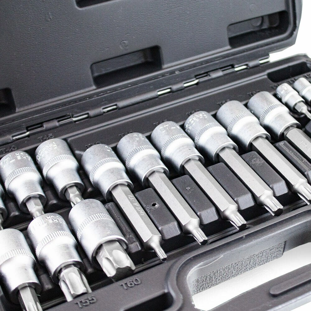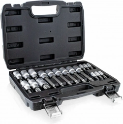 Ten 18‑elementowy zestaw nasadek TORX obejmuje najczęściej używane rozmiary do serwisowania samochodów, maszyn oraz napraw domowych. Nasadki z stali chromowo‑wanadowej zapewniają wysoką wytrzymałość, długą żywotność i niezawodne przenoszenie siły. Dołączona odporna walizka z metalowymi zatrzaskami utrzymuje wszystko przejrzyście i bezpiecznie na swoim miejscu.
