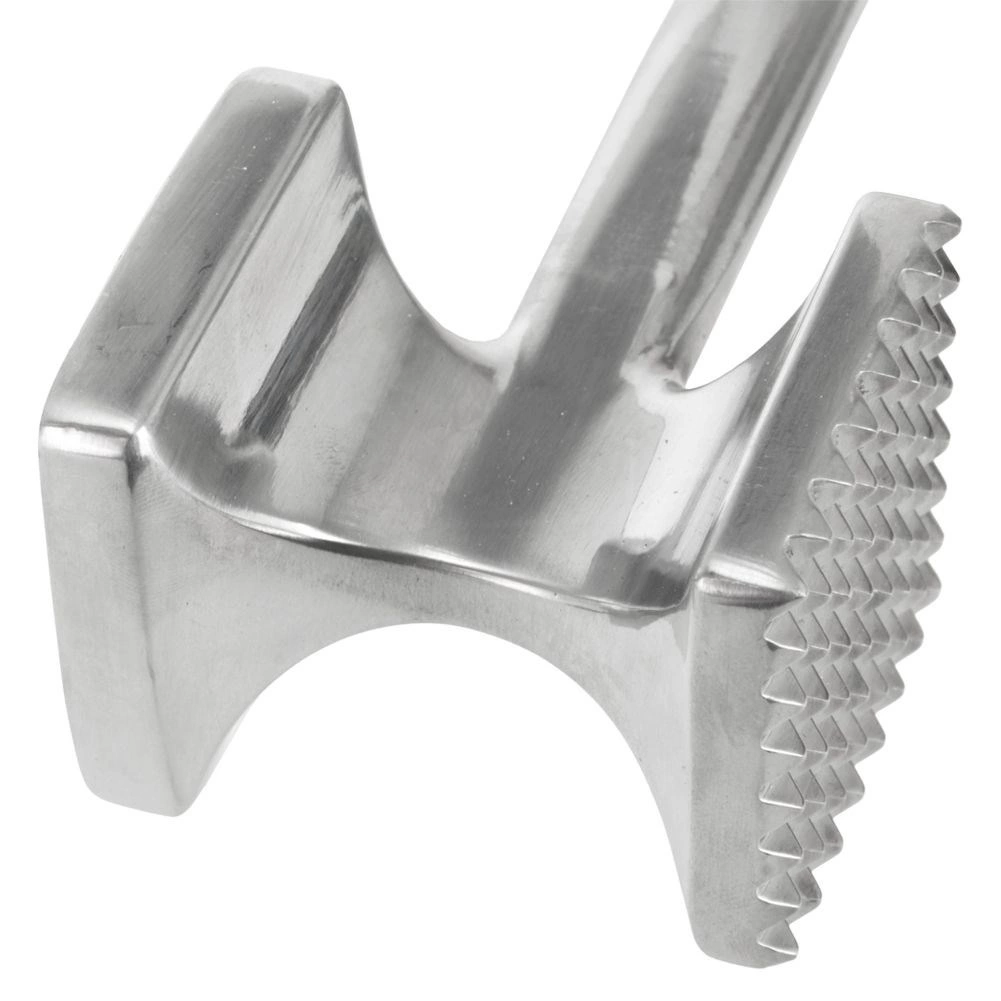 Praktyczny, dwustronny tenderizer z aluminium o długości 26,5 cm z dwiema powierzchniami roboczymi – gładką do spłaszczania oraz teksturą do rozbijania i zmiękczania. Ergonomiczny antypoślizgowy uchwyt zapewnia pewny chwyt, narzędzie jest wytrzymałe, łatwe w czyszczeniu i odpowiednie do różnych rodzajów mięsa oraz innych składników.