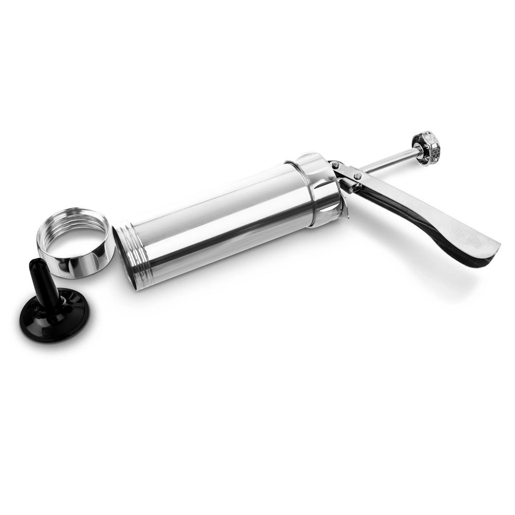 Ten 25-częściowy zestaw łączy prasę do ciastek i pistolet do dekorowania w jednym narzędziu, dzięki czemu z łatwością wykonasz formowanie ciasta, zdobienie kremem oraz nadziewanie pączków. Metalowy korpus wyróżnia się długą żywotnością i stabilnością pracy, a ergonomiczna dźwignia z tłokiem umożliwia precyzyjne i powtarzalne dozowanie.