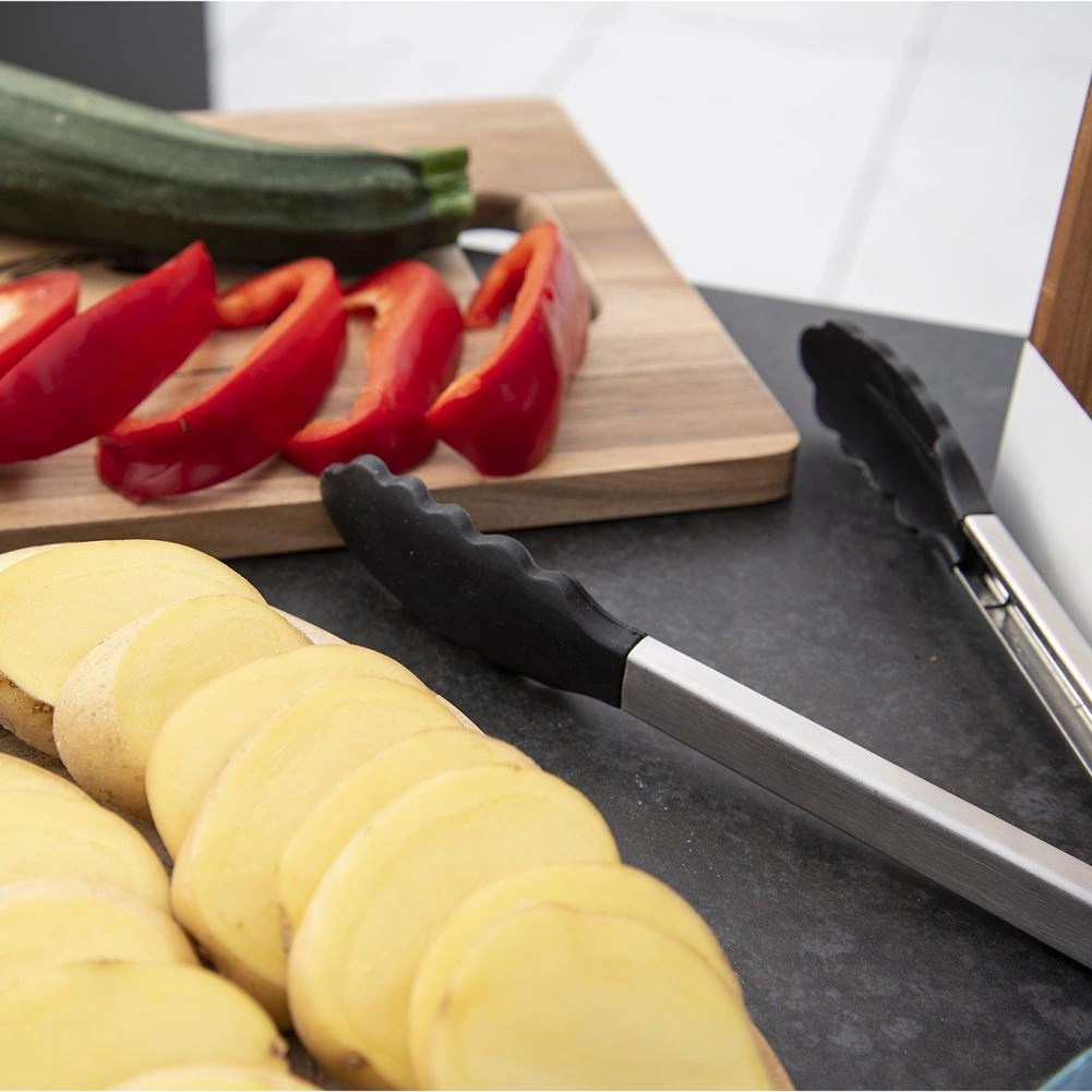 Te uniwersalne szczypce kuchenne to świetny pomocnik podczas codziennego gotowania i grillowania. Ramiona ze stali nierdzewnej zapewniają wysoką wytrzymałość i długą żywotność, a karbowane silikonowe końcówki gwarantują pewny chwyt bez rysowania naczyń. Dzięki oczku z pierścieniem blokującym łatwo je zawiesisz i przechowasz w pozycji zamkniętej.