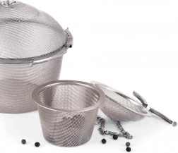 Praktyczne stalowe sitko do przypraw o średnicy 6 cm i wysokości 6 cm do łatwego doprawiania zup, wywarów, sosów oraz herbat. Ma drobną, gęsto tkaną siateczkę, zamykany koszyczek oraz łańcuszek z haczykiem do wygodnego zawieszenia na brzegu garnka lub czajnika. Wykonane z wysokiej jakości stali nierdzewnej dla długiej żywotności i łatwej pielęgnacji.
