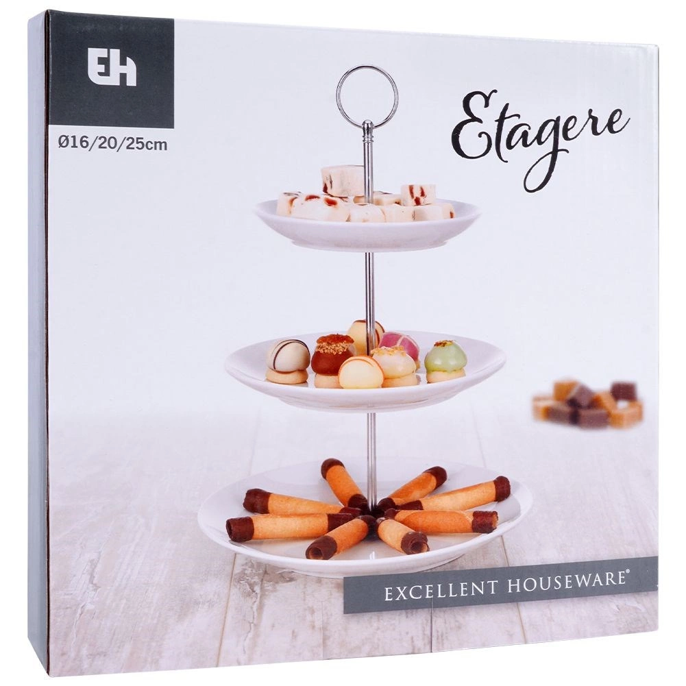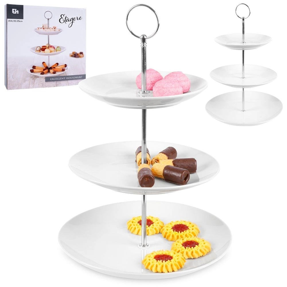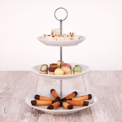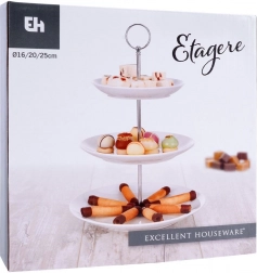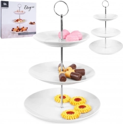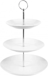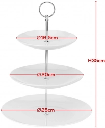 Każdy poziom ma inną średnicę (25 cm, 20 cm, 16,5 cm), co pozwala na przejrzyste ułożenie smakołyków i atrakcyjne, warstwowe serwowanie. Praktyczne górne oczko ułatwia przenoszenie całej piętrowej misy. Etażerka nadaje się do użytku domowego i profesjonalnego, a jej wykonanie spełnia europejskie standardy.