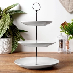 Pionowy design oszczędza miejsce na stole i blacie kuchennym. Górny pierścień umożliwia bezpieczne przenoszenie całej etażerki.