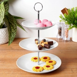 Ta trzypoziomowa porcelanowa etażerka o wysokości 35 cm to doskonały wybór do serwowania babeczek, ciasteczek, mini deserów, serów czy owocowych koreczków. Łączy ponadczasową białą porcelanę ze stabilną metalową konstrukcją, dzięki czemu świetnie prezentuje się zarówno na odświętnym stole, jak i podczas codziennych posiłków.