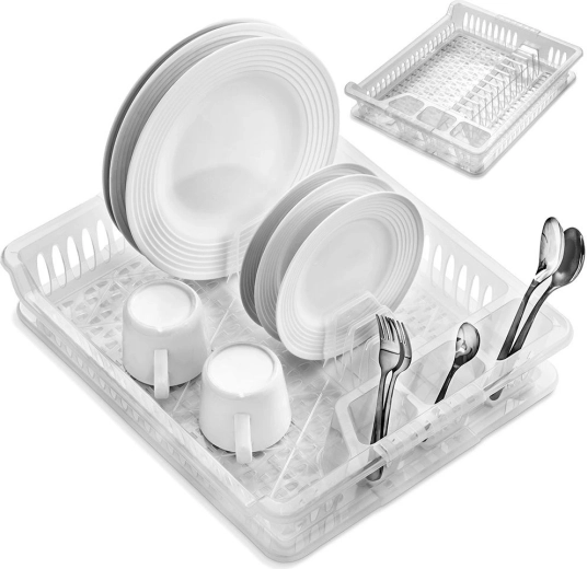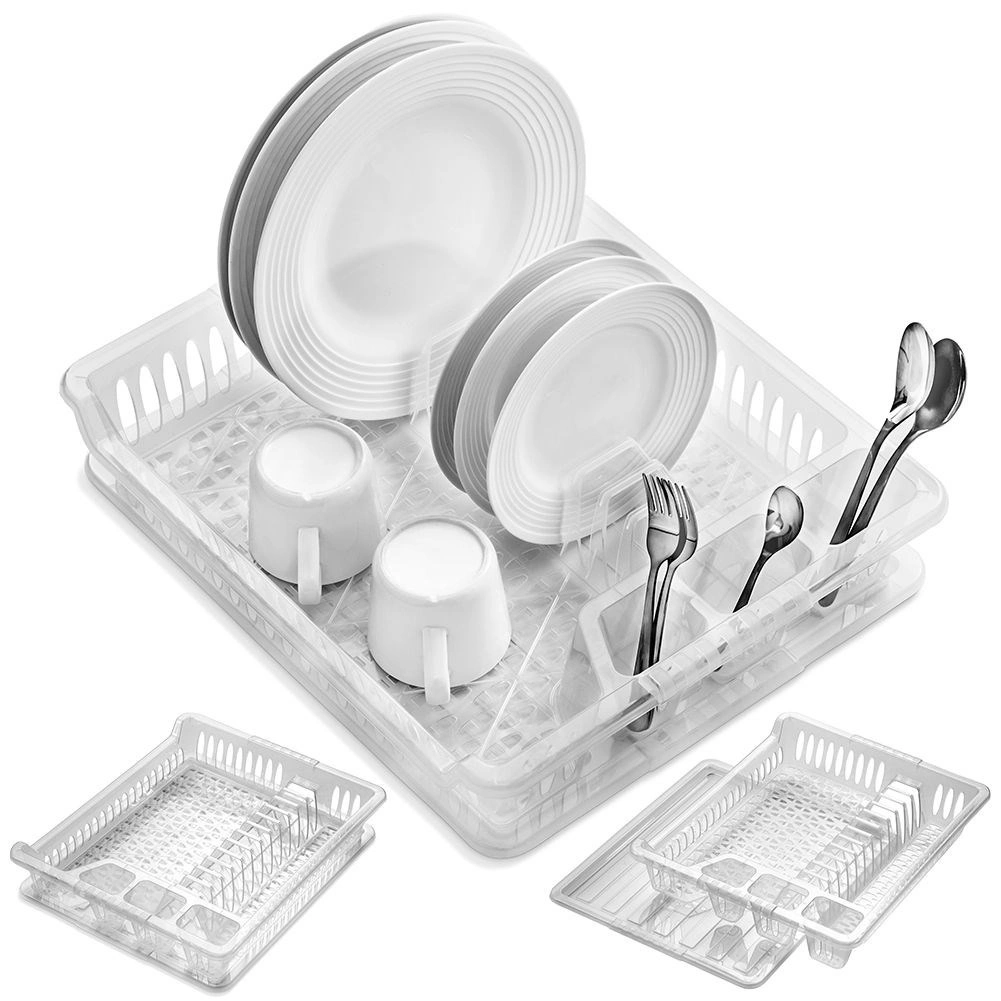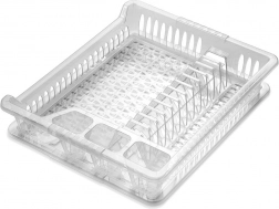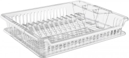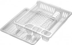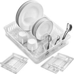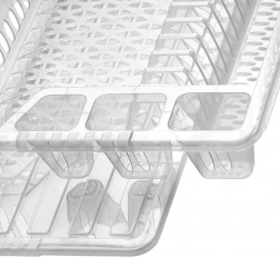 Kompaktowy ociekacz na naczynia z wysokiej jakości półprzezroczystego plastiku z wyjmowaną tacą ociekową. Oferuje miejsce na 12 talerzy, przestrzeń na kubki i miski oraz 3 przegródki na sztućce. Utrzymuje blat kuchenny czysty i suchy, jest łatwy do umycia i pasuje do nowoczesnych oraz klasycznych kuchni.