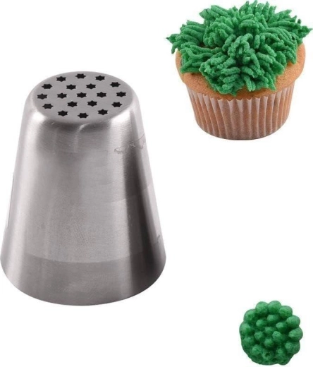 Uniwersalna rosyjska tylka cukiernicza ze stali nierdzewnej do dekorowania w kształcie trawy lub włosów. Idealna do tortów, ciast i deserów. Wykonana z wysokiej jakości stali nierdzewnej, bezszwowa, trwała i bezpieczna dla zdrowia. Łatwa w czyszczeniu, odpowiednia do zmywarki i pasuje do wszystkich rękawów cukierniczych.